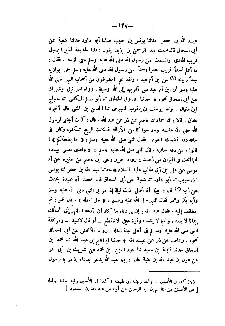 حَدَّثَنَا فَارُوقٌ الْخَطَّابِيُّ، ثَنَا أَبُو مُسْلِمٍ الْكَشِّيُّ، ثَنَا حَجَّاجُ بْنُ مِنْهَالٍ، وَثَنَا يُوسُفُ بْنُ يَعْقُوبَ النَّجِيرَمِيُّ، ثَنَا الْحَسَنُ بْنُ الْمُثَنَّى، قَالَ: أَخْبَرَنَا عَفَّانُ، قَالَا: ثَنَا حَمَّادٌ، ثَنَا عَاصِمٌ، عَنْ ذَرٍّ، عَنْ عَبْدِ اللهِ، قَالَ: " كُنْتُ أَجْتَنِي لِرَسُولِ اللهِ صَلَّى اللهُ عَلَيْهِ وَسَلَّمَ سِوَاكًا مِنَ الْأَرَاكِ، فَكَانَتِ الرِّيحُ تَكْفُوهُ، وَكَانَ فِي سَاقِهِ دِقَّةٌ، فَضَحِكَ الْقَوْمُ، فَقَالَ النَّبِيُّ صَلَّى اللهُ عَلَيْهِ وَسَلَّمَ: «مَا يُضْحِكُكُمْ؟» قَالُوا: مِنْ دِقَّةِ سَاقَيْهِ، قَالَ النَّبِيُّ صَلَّى اللهُ عَلَيْهِ وَسَلَّمَ: «وَالَّذِي نَفْسِي بِيَدِهِ §لَهُمَا أَثْقَلُ فِي الْمِيزَانِ مِنْ أُحُدٍ» رَوَاهُ جَرِيرٌ وَعَلِيُّ بْنُ عَاصِمٍ عَنْ مُغِيرَةَ عَنْ أُمِّ مُوسَى عَنْ عَلِيِّ بْنِ أَبِي طَالِبٍ عَلَيْهِ السَّلَامُ