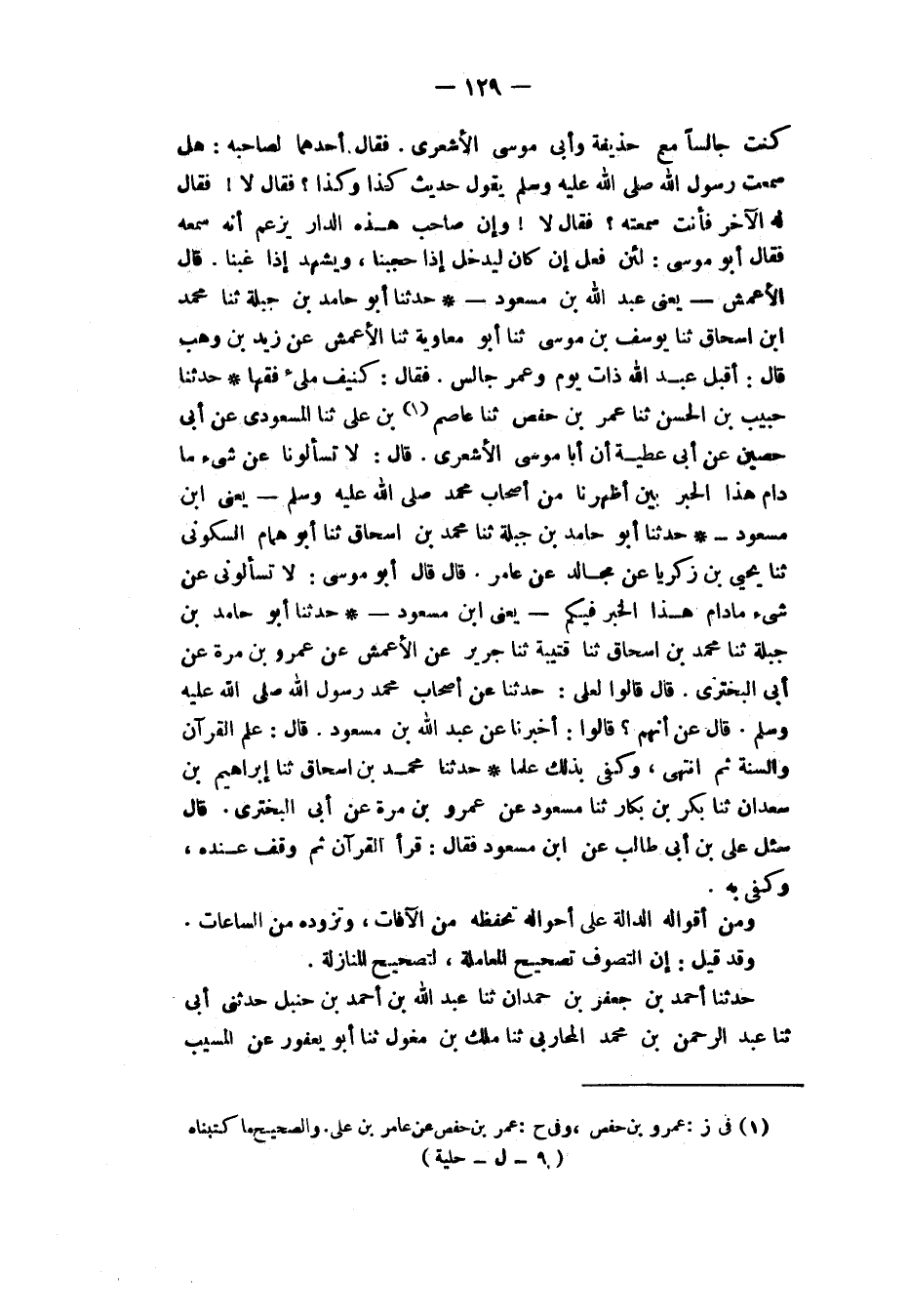 حَدَّثَنَا مُحَمَّدُ بْنُ إِسْحَاقَ، ثَنَا إِبْرَاهِيمُ بْنُ سَعْدَانَ، ثَنَا بَكْرُ بْنُ بَكَّارٍ، ثَنَا مِسْعَرٌ، عَنْ عَمْرِو بْنِ مُرَّةَ، عَنْ أَبِي الْبُخْتُرِيِّ، قَالَ: سُئِلَ عَلِيُّ بْنُ أَبِي طَالِبٍ عَنِ ابْنِ مَسْعُودٍ، فَقَالَ: «§قَرَأَ الْقُرْآنَ ثُمَّ وَقَفَ عِنْدَهُ، وَكَفَى بِهِ» وَمِنْ أَقْوَالِهِ الدَّالَّةِ عَلَى أَحْوَالِهِ تَحَفُّظُهُ مِنَ الْآفَاتِ، وَتَزَوُّدُهُ مِنَ السَّاعَاتِ. وَقَدْ قِيلَ: " إِنَّ التَّصَوُّفَ تَصْحِيحُ الْمُعَامَلَةِ، لِتَصْحِيحِ الْمُنَازَلَةِ