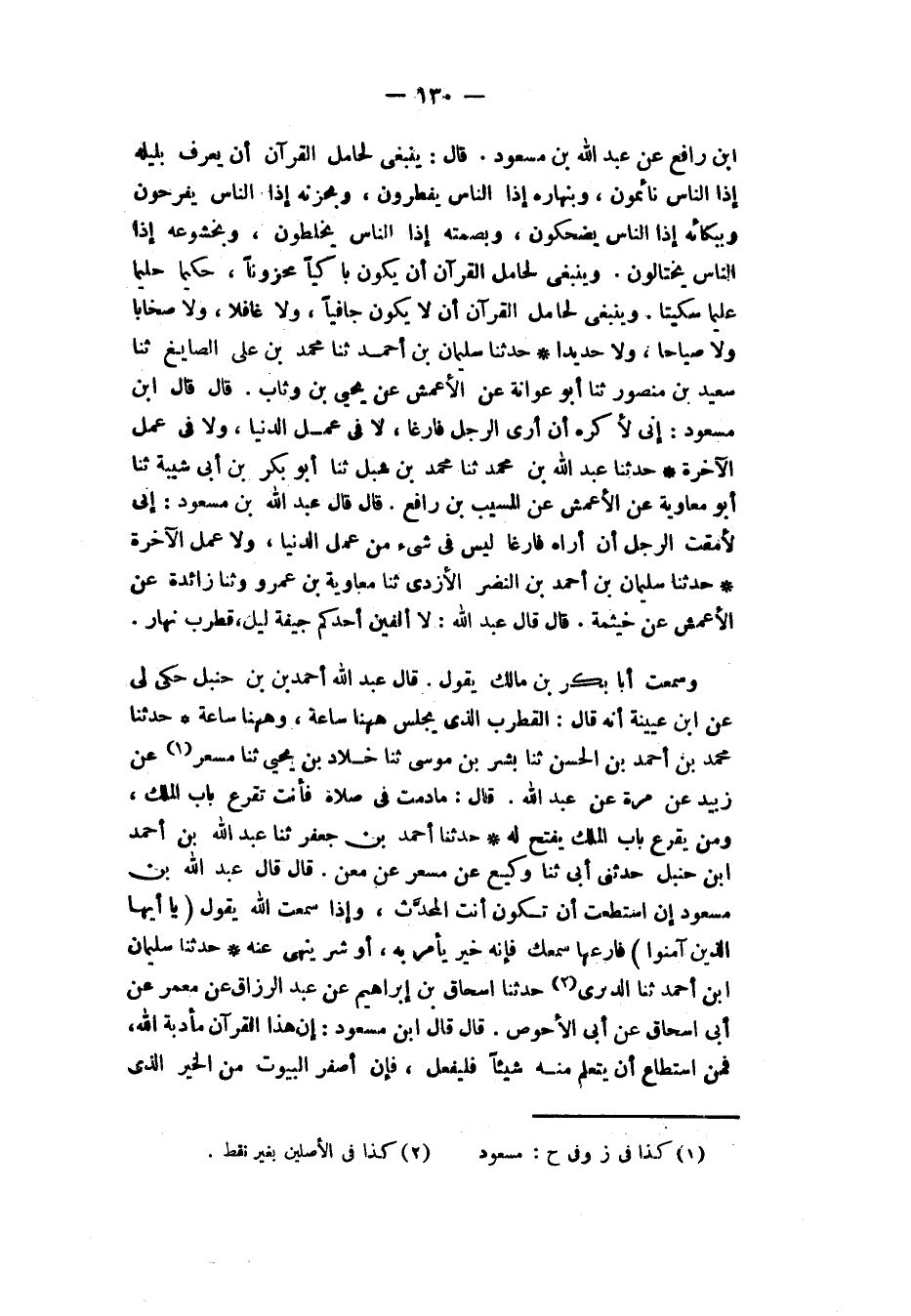 حَدَّثَنَا سُلَيْمَانُ بْنُ أَحْمَدَ بْنِ النَّضْرِ الْأَزْدِيُّ، ثَنَا مُعَاوِيَةُ بْنُ عَمْرٍو، ثَنَا زَائِدَةُ، عَنِ الْأَعْمَشِ، عَنْ خَيْثَمَةَ، قَالَ: قَالَ عَبْدُ اللهِ «§لَا أَلْفَيَنَّ أَحَدَكُمْ جِيفَةَ لَيْلٍ، قُطْرُبَ نَهَارٍ» وَسَمِعْتُ أَبَا بَكْرِ بْنَ مَالِكٍ يَقُولُ: قَالَ عَبْدُ اللهِ بْنُ أَحْمَدُ بْنُ حَنْبَلٍ: حُكِيَ لِي عَنِ ابْنِ عُيَيْنَةَ أَنَّهُ قَالَ: الْقُطْرُبُ الَّذِي يَجْلِسُ هَهُنَا سَاعَةً، وَهَهُنَا سَاعَةً