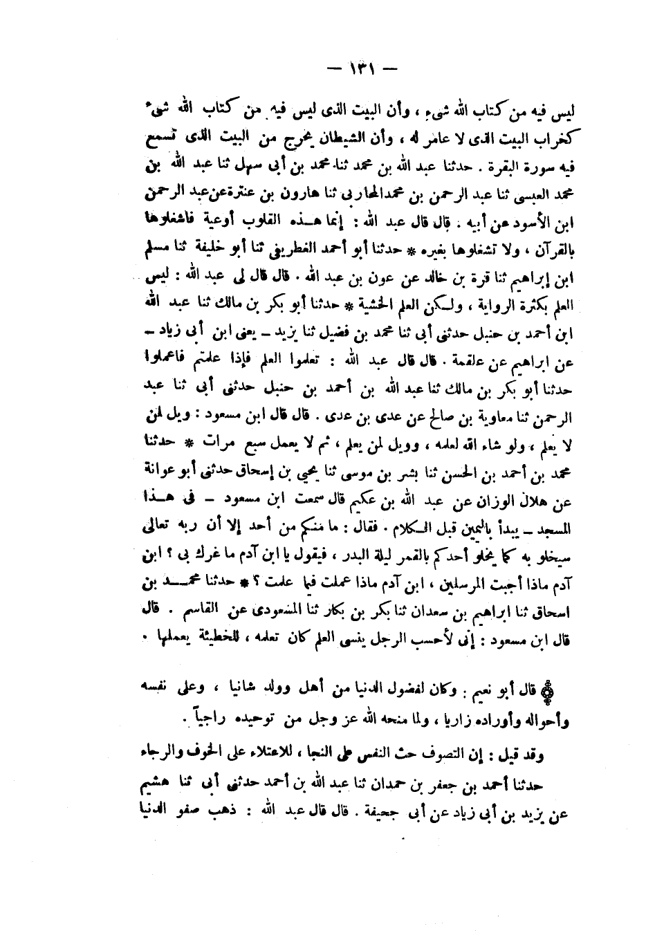 حَدَّثَنَا مُحَمَّدُ بْنُ إِسْحَاقَ، ثَنَا إِبْرَاهِيمُ بْنُ سَعْدَانَ، ثَنَا بَكْرُ بْنُ بَكَّارٍ، ثَنَا الْمَسْعُودِيُّ، عَنِ الْقَاسِمِ، قَالَ: قَالَ ابْنُ مَسْعُودٍ: «إِنِّي لَأَحْسَبُ §الرَّجُلَ يَنْسَى الْعِلْمَ كَانَ تَعَلَّمَهُ، لِلْخَطِيئَةِ يَعْمَلُهَا» قَالَ أَبُو نُعَيْمٍ: وَكَانَ لِفُضُولِ الدُّنْيَا مِنْ أَهْلٍ وَوَلَدٍ شَانِيًا، وَعَلَى نَفْسِهِ وَأَحْوَالِهِ وَأَوْرَادِهِ زَارِيًا، وَلِمَا مَنَحَهُ اللهُ عَزَّ وَجَلَّ مِنْ تَوْحِيدِهِ رَاجِيًا. وَقَدْ قِيلَ: " إِنَّ التَّصَوُّفَ حَثُّ النَّفْسِ عَلَى النَّجَا، لِلِاعْتِلَاءِ عَلَى الْخَوْفِ وَالرَّجَاءِ