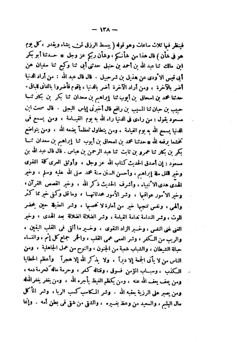 حَدَّثَنَا مُحَمَّدُ بْنُ إِسْحَاقَ بْنَ أَيُّوبَ، ثَنَا إِبْرَاهِيمُ بْنُ سَعْدَانَ، ثَنَا بَكْرُ بْنُ بَكَّارٍ، ثَنَا عَمْرُو بْنُ ثَابِتٍ، ثَنَا عَبْدُ الرَّحْمَنِ بْنُ عَبَّاسٍ، قَالَ: قَالَ عَبْدُ اللهِ بْنُ مَسْعُودٍ: «إِنَّ §أَصْدَقَ الْحَدِيثِ كِتَابُ اللهِ عَزَّ وَجَلَّ، وَأَوْثَقُ الْعُرَى كَلِمَةُ التَّقْوَى، وَخَيْرُ الْمِلَلِ مِلَّةُ إِبْرَاهِيمَ، وَأَحْسَنُ السُّنَنِ سُنَّةُ مُحَمَّدٍ صَلَّى اللهُ عَلَيْهِ وَسَلَّمَ، وَخَيْرُ الْهُدَى هُدَى الْأَنْبِيَاءِ، وَأَشْرَفُ الْحَدِيثِ ذِكْرُ اللهِ، وَخَيْرُ الْقَصَصِ الْقُرْآنُ، وَخَيْرُ الْأُمُورِ عَوَاقِبُهَا، وَشَرُّ الْأُمُورِ مُحْدَثَاتُهَا، وَمَا قَلَّ وَكَفَى خَيْرٌ مِمَّا كَثُرَ وَأَلْهَى، وَنَفْسٌ تُنْجِيهَا خَيْرٌ مِنْ أَمَّارَةٍ لَا تُحْصِيهَا، وَشَرُّ الْعَذِيلَةِ حِينَ يَحْضُرُ الْمَوْتُ، وَشَرُّ النَّدَامَةِ نَدَامَةُ الْقِيَامَةِ، وَشَرُّ الضَّلَالَةِ الضَّلَالَةُ بَعْدَ الْهُدَى، وَخَيْرُ الْغِنَى غِنَى النَّفْسِ، وَخَيْرُ الزَّادِ التَّقْوَى، وَخَيْرُ مَا أُلْقِيَ فِي الْقَلْبِ الْيَقِينُ، وَالرَّيْبُ مِنَ الْكُفْرِ، وَشَرُّ الْعَمَى عَمَى الْقَلْبِ، وَالْخَمْرُ جِمَاعُ كُلِّ إِثْمٍ، وَالنِّسَاءُ حِبَالَةُ الشَّيْطَانِ، وَالشَّبَابُ شُعْبَةٌ مِنَ الْجُنُونِ، وَالنَّوْحُ مِنْ عَمَلِ الْجَاهِلِيَّةِ، وَمِنَ النَّاسِ مَنْ لَا يَأْتِي الْجُمُعَةَ إِلَّا دُبْرًا، وَلَا يَذْكُرُ اللهَ إِلَّا هَجْرًا، وَأَعْظَمُ الْخَطَايَا الْكَذِبُ، وَسِبَابُ الْمُؤْمِنِ فُسُوقٌ، وَقِتَالُهُ كُفْرٌ، وَحُرْمَةُ مَالِهِ كَحُرْمَةِ دَمِهِ، وَمَنْ يَعْفُ يَعْفُ اللهُ عَنْهُ، وَمَنْ يَكْظِمِ الْغَيْظَ يَأْجُرْهُ اللهُ، وَمَنْ يَغْفِرْ يَغْفِرِ اللهُ لَهُ، وَمَنْ يَصْبِرْ عَلَى الرَّزِيَّةِ يُعْقِبْهُ اللهُ، وَشَرُّ الْمَكَاسِبِ كَسْبُ الرِّبَا، وَشَرُّ الْمَأْكَلِ مَالُ الْيَتِيمِ، وَالسَّعِيدُ مَنْ وُعِظَ بِغَيْرِهِ، وَالشَّقِيُّ مَنْ شَقِيَّ فِي بَطْنِ أُمِّهِ، وَإِنَّمَا -[139]- يَكْفِي أَحَدُكُمْ مَا قَنَعَتْ بِهِ نَفْسُهُ، وَإِنَّمَا يَصِيرُ إِلَى أَرْبَعَةِ أَذْرُعٍ، وَالْأَمْرُ إِلَى آخِرَةٍ، وَمِلَاكُ الْعَمَلِ خَوَاتِمُهُ، وَشَرُّ الرَّوَايَا رَوَايَا الْكَذِبِ، وَأَشْرَفُ الْمَوْتِ قَتْلُ الشُّهَدَاءِ، وَمَنْ يَعْرِفِ الْبَلَاءَ يَصْبِرْ عَلَيْهِ، وَمَنْ لَا يَعْرِفْ يُنْكِرْ، وَمَنْ يَسْتَكْبِرْ يَضَعْهُ، وَمَنْ يَتَوَلَّى الدُّنْيَا تَعْجَزْ عَنْهُ، وَمَنْ يُطِعِ الشَّيْطَانَ يَعْصِ اللهَ، وَمَنْ يَعْصِ اللهَ يُعَذِّبْهُ»