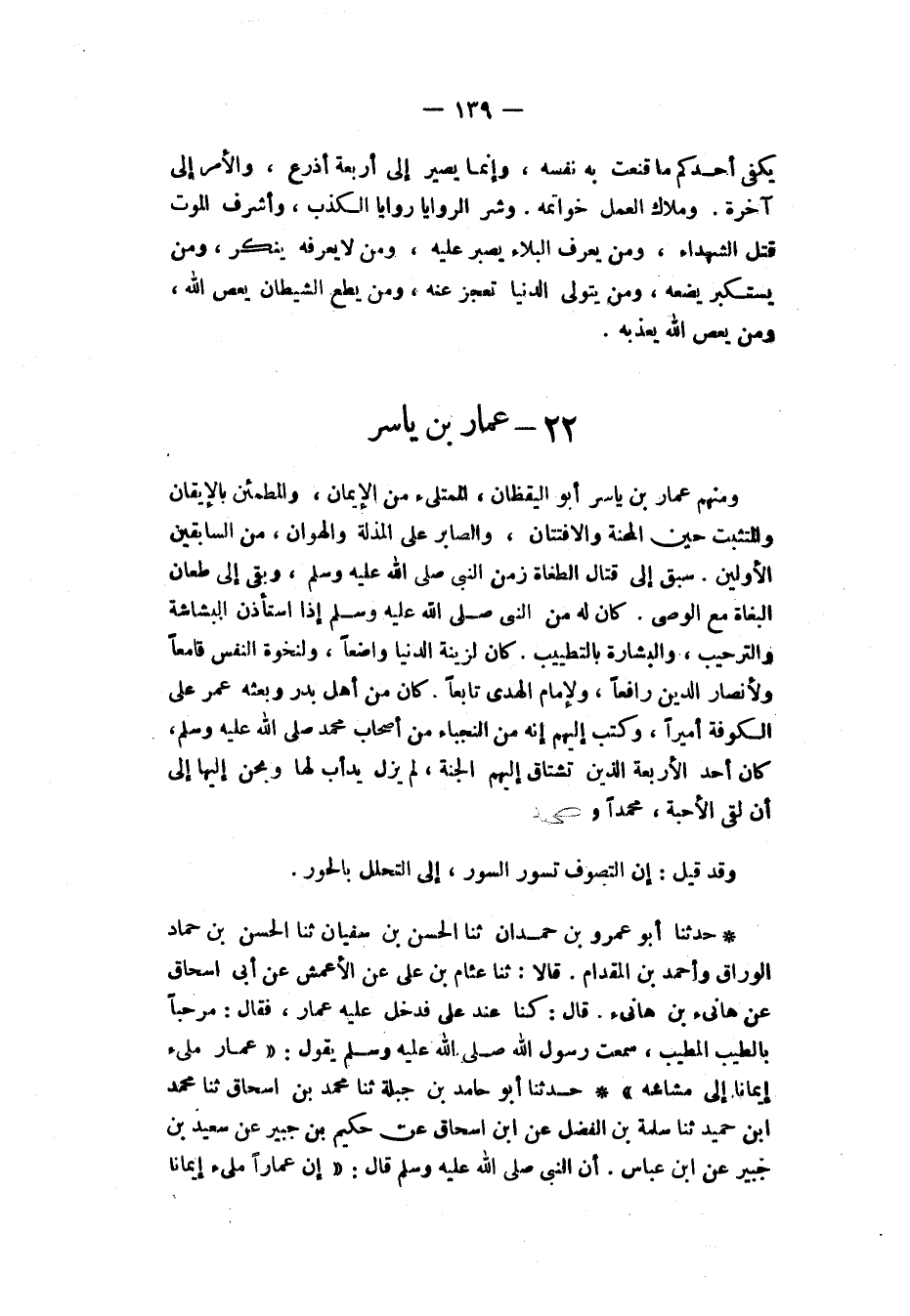 §عَمَّارُ بْنُ يَاسِرٍ وَمِنْهُمْ عَمَّارُ بْنُ يَاسِرٍ أَبُو الْيَقْظَانِ، الْمُمْتَلِئُ مِنَ الْإِيمَانِ، وَالْمُطْمَئِنُّ بِالْإِيقَانِ، وَالْمُتَثَبِّتُ حِينَ الْمِحْنَةِ وَالِافْتِتَانِ، وَالصَّابِرُ عَلَى الْمَذَلَّةِ وَالْهَوَانِ، مِنَ السَّابِقِينَ الْأَوَّلِينَ، سَبَقَ إِلَى قِتَالِ الطُّغَاةِ زَمَنَ النَّبِيِّ صَلَّى اللهُ عَلَيْهِ وَسَلَّمَ، وَبَقِيَ إِلَى طَعَانِ الْبُغَاةِ مَعَ الْوَصِيِّ، كَانَ لَهُ مِنَ النَّبِيِّ صَلَّى اللهُ عَلَيْهِ وَسَلَّمَ إِذَا اسْتَأْذَنَ الْبَشَاشَةُ وَالتَّرْحِيبُ، وَالْبِشَارَةُ بِالتَّطْيِيبِ، كَانَ لِزِينَةِ الدُّنْيَا وَاضِعًا، وَلِنَخْوَةِ النَّفْسِ قَامِعًا، وَلِأَنْصَارِ الدِّينِ رَافِعًا، وَلِإِمَامِ الْهُدَى تَابِعًا، كَانَ مِنْ أَهْلِ بَدْرٍ، وَبَعْثَهُ عُمَرُ عَلَى الْكُوفَةِ أَمِيرًا، وَكَتَبَ إِلَيْهِمْ أَنَّهُ مِنَ النُّجَبَاءِ مِنْ أَصْحَابِ مُحَمَّدٍ صَلَّى اللهُ عَلَيْهِ وَسَلَّمَ، كَانَ أَحَدَ الْأَرْبَعَةِ الَّذِينَ تَشْتَاقُ إِلَيْهِمُ الْجَنَّةُ، لَمْ يَزَلْ يَدْأَبُ لَهَا وَيَحِنُّ إِلَيْهَا إِلَى أَنْ لَقِيَ الْأَحِبَّةَ مُحَمَّدًا وَصَحْبَهُ. وَقَدْ قِيلَ: «إِنَّ التَّصَوُّفَ تَسَوُّرُ السُّورِ، إِلَى التَّحَلُّلِ بِالْحُورِ»