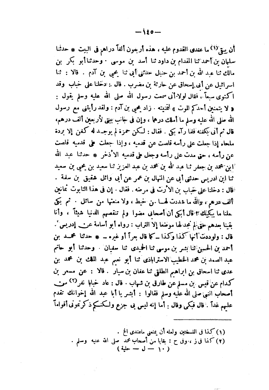 حَدَّثَنَا مُحَمَّدُ بْنُ أَحْمَدَ بْنِ الْحَسَنِ، ثَنَا بِشْرُ بْنُ مُوسَى، ثَنَا الْحُمَيْدِيُّ، ثَنَا سُفْيَانُ، وَحَدَّثَنَا أَبُو حَاتِمٍ عَبْدُ الصَّمَدِ بْنُ مُحَمَّدٍ الْخَطِيبُ الْأَسْتَرَابَاذِيُّ، ثَنَا أَبُو نُعَيْمٍ عَبْدُ الْمَلِكِ بْنُ مُحَمَّدِ بْنِ عَدِيٍّ، ثَنَا إِسْحَاقُ بْنُ إِبْرَاهِيمَ الطَّلْقِيُّ، ثَنَا عَفَّانُ بْنُ سَيَّارٍ، قَالَا: عَنْ مِسْعَرِ بْنِ كِدَامٍ، عَنْ قَيْسِ بْنِ مُسْلِمٍ، عَنْ طَارِقِ بْنِ شِهَابٍ، قَالَ: عَادَ خَبَّابًا نَفَرٌ مِنْ أَصْحَابِ النَّبِيِّ صَلَّى اللهُ عَلَيْهِ وَسَلَّمَ فَقَالُوا: أَبْشِرْ يَا أَبَا عَبْدِ اللهِ، إِخْوَانُكَ تَقَدَمُ عَلَيْهِمْ غَدًا، قَالَ: فَبَكَى وَقَالَ: «أَمَا إِنَّهُ §لَيْسَ بِي جَزَعٌ، وَلَكِنَّكُمْ ذَكَّرْتُمُونِي أَقْوَامًا -[146]-، وَسَمَّيْتُمْ لِي إِخْوَانًا، وَإِنَّ أُولَئِكَ قَدْ مَضَوْا بِأُجُورِهِمْ كُلُّهُمْ، وَإِنِّي أَخَافُ أَنْ يَكُونَ ثَوَابُ مَا تَذْكُرُونَ مِنْ تِلْكَ الْأَعْمَالِ مَا أُوتِينَا بَعْدَهُمْ» لَفْظُ عَفَّانَ