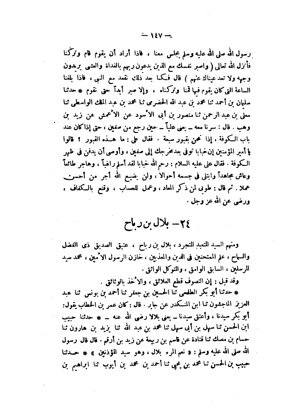 §بِلَالُ بْنُ رَبَاحٍ وَمِنْهُمُ السَّيِّدُ الْمُتَعَبِّدُ الْمُتَجَرِّدُ، بِلَالُ بْنُ رَبَاحٍ، عَتِيقُ الصِّدِّيقِ ذِي الْفَضْلِ وَالسَّمَاحِ، عَلَمُ الْمُمْتَحَنِينَ فِي الدِّينِ وَالْمُعَذَّبِينَ، خَازِنُ الرَّسُولِ الْأَمِينِ مُحَمَّدٍ سَيِّدِ الْمُرْسَلِينَ، السَّابِقُ الْوَامِقُ، وَالْمُتَوَكِّلُ الْوَاثِقُ. وَقَدْ قِيلَ: «إِنَّ التَّصَوُّفَ قَطْعُ الْعَلَائِقِ، وَالْأَخْذُ بِالْوَثَائِقِ»