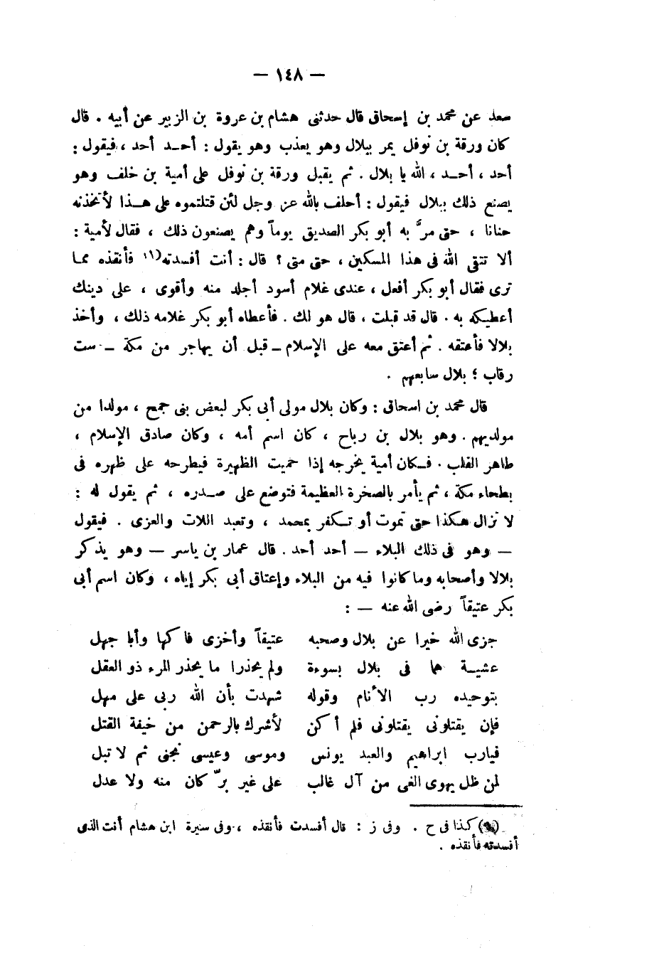 سَعْدٍ، عَنْ مُحَمَّدِ بْنِ إِسْحَاقَ، قَالَ: حَدَّثَنِي هِشَامُ بْنُ عُرْوَةَ بْنِ الزُّبَيْرِ، عَنْ أَبِيهِ، قَالَ: " كَانَ وَرَقَةُ بْنُ نَوْفَلٍ يَمُرُّ بِبِلَالٍ وَهُوَ يُعَذَّبُ وَهُوَ يَقُولُ: أَحَدٌ أَحَدٌ، فَيَقُولُ: أَحَدٌ أَحَدٌ، اللهَ يَا بِلَالُ، ثُمَّ يُقْبِلُ وَرَقَةُ بْنُ نَوْفَلٍ عَلَى أُمَيَّةَ بْنِ خَلَفٍ، وَهُوَ يَصْنَعُ ذَلِكَ بِبِلَالٍ فَيَقُولُ: أَحْلِفُ بِاللهِ عَزَّ وَجَلَّ §لَئِنْ قَتَلْتُمُوهُ عَلَى هَذَا لَأَتَّخِذَنَّهُ حَنَانًا، حَتَّى مَرَّ بِهِ أَبُو بَكْرٍ الصِّدِّيقُ يَوْمًا وَهُمْ يَصْنَعُونَ ذَلِكَ فَقَالَ لِأُمَيَّةَ: أَلَا تَتَّقِي اللهَ فِي هَذَا الْمِسْكِينِ، حَتَّى مَتَى؟ قَالَ: أَنْتَ أَفْسَدْتَهُ، فَأَنْقِذْهُ مِمَّا تَرَى، فَقَالَ أَبُو بَكْرٍ: أَفْعَلُ، عِنْدِي غُلَامٌ أَسْوَدُ أَجْلَدُ مِنْهُ وَأَقْوَى عَلَى دِينِكَ أُعْطِيكَهُ بِهِ، قَالَ: قَدْ قَبِلْتُ، قَالَ: هُوَ لَكَ، فَأَعْطَاهُ أَبُو بَكْرٍ غُلَامَ ذَلِكَ وَأَخَذَ بِلَالًا فَأَعْتَقَهُ، ثُمَّ أَعْتَقَ مَعَهُ عَلَى الْإِسْلَامِ قَبْلَ أَنْ يُهَاجِرَ مِنْ مَكَّةَ سِتَّ رِقَابٍ، بِلَالٌ سَابِعُهُمْ " قَالَ مُحَمَّدُ بْنُ إِسْحَاقَ: " وَكَانَ بِلَالٌ مُولَى أَبِي بَكْرٍ لِبَعْضِ بَنِي جُمَحَ، مُوَلِّدًا مِنْ مُوَلِّدِيهِمْ، وَهُوَ بِلَالُ بْنُ رَبَاحٍ، كَانَ اسْمَ أُمِّهِ حَمَامَةُ، وَكَانَ صَادِقَ الْإِسْلَامِ طَاهِرَ الْقَلْبِ، فَكَانَ أُمَيَّةُ يُخْرِجُهُ إِذَا حَمِيَتِ الظَّهِيرَةُ فَيَطْرَحُهُ عَلَى ظَهْرِهِ فِي بَطْحَاءِ مَكَّةَ، ثُمَّ يَأْمُرُ بِالصَّخْرَةِ الْعَظِيمَةِ فَتُوضَعُ عَلَى صَدْرِهِ ثُمَّ يَقُولُ لَهُ: لَا تَزَالُ هَكَذَا حَتَّى تَمُوتَ، أَوْ تَكْفُرَ بِمُحَمَّدٍ وَتَعْبُدَ اللَّاتَ وَالْعُزَّى، فَيَقُولُ وَهُوَ فِي ذَلِكَ الْبَلَاءِ: أَحَدٌ أَحَدٌ "