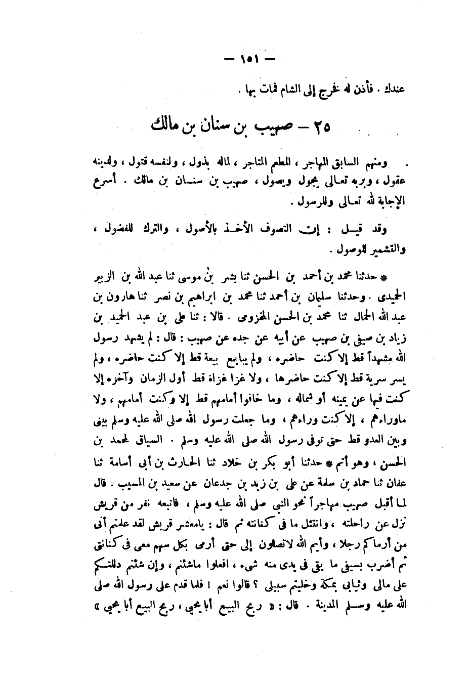 §صُهَيْبُ بْنُ سِنَانِ بْنِ مَالِكٍ وَمِنْهُمُ السَّابِقُ الْمُهَاجِرُ، الْمُطْعِمُ الْمُتَاجِرُ، لِمَالِهِ بَذُولٌ، وَلِنَفْسِهِ قَتُولٌ، وَلِدِينِهِ عَقُولٌ، وَبِرَبِّهِ تَعَالَى يَجُولُ وَيَصُولُ، صُهَيْبُ بْنُ سِنَانِ بْنِ مَالِكٍ، أَسْرَعَ الْإِجَابَةَ لِلَّهِ تَعَالَى وَلِلرَّسُولِ. وَقَدْ قِيلَ: «إِنَّ التَّصَوُّفَ الْأَخْذُ بِالْأُصُولِ، وَالتَّرْكُ لِلْفُضُولِ، وَالتَّشْمِيرُ لِلْوصُولِ»