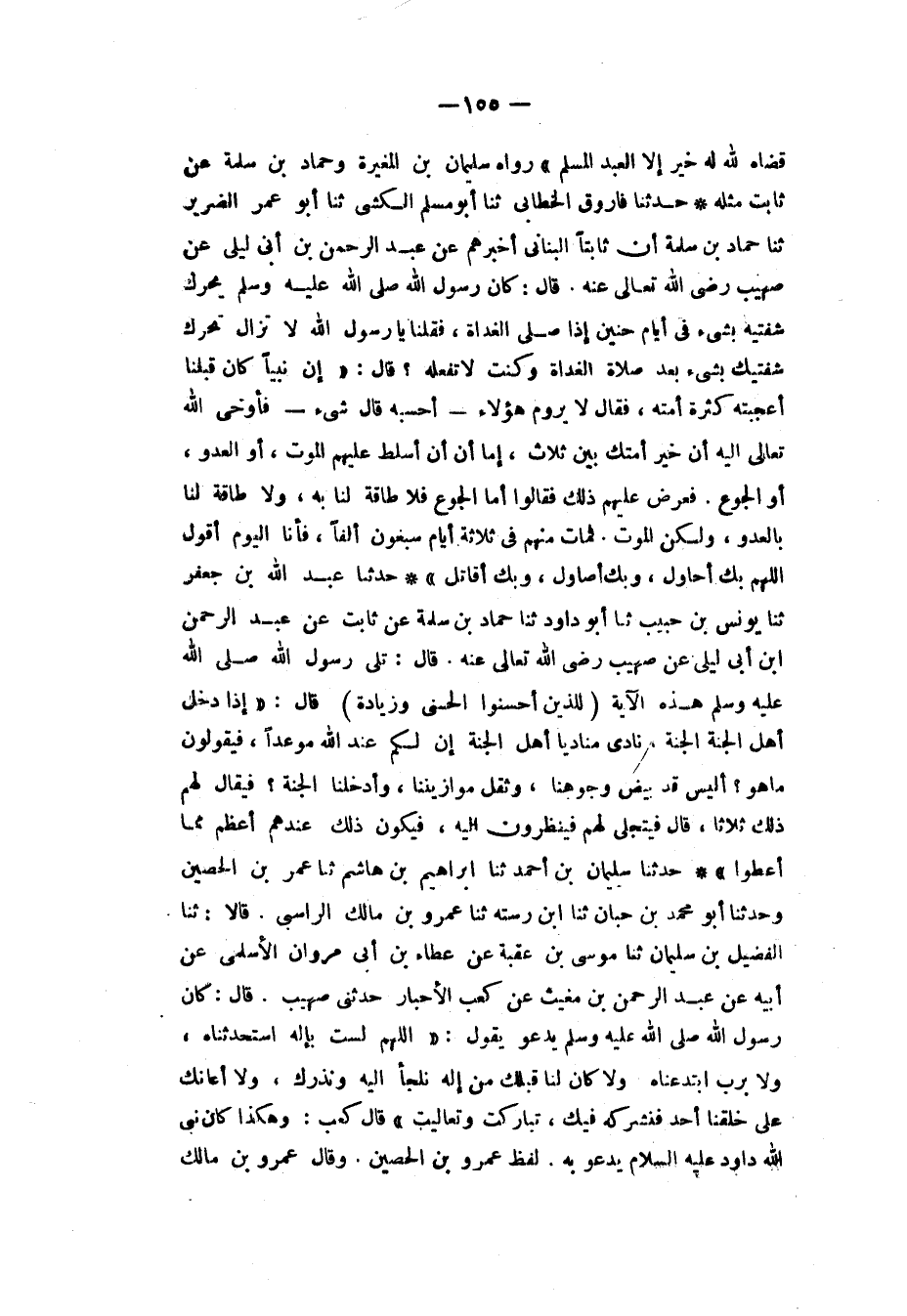 حَدَّثَنَا فَارُوقٌ الْخَطَّابِيُّ، ثَنَا أَبُو مُسْلِمٍ الْكَشِّيُّ، ثَنَا أَبُو عُمَرَ الضَّرِيرُ، ثَنَا حَمَّادُ بْنُ سَلَمَةَ، أَنَّ ثَابِتًا الْبُنَانِيَّ، أَخْبَرَهُمْ، عَنْ عَبْدِ الرَّحْمَنِ بْنِ أَبِي لَيْلَى، عَنْ صُهَيْبٍ، رَضِيَ اللهُ تَعَالَى عَنْهُ قَالَ: " كَانَ رَسُولُ اللهِ صَلَّى اللهُ عَلَيْهِ وَسَلَّمَ يُحَرِّكُ شَفَتَيْهِ بِشَيْءٍ فِي أَيَّامٍ حنَيْنَ إِذَا صَلَّى الْغَدَاةَ، فَقُلْنَا: يَا رَسُولَ اللهِ، لَا تَزَالُ تُحَرِّكُ شَفَتَيْكَ بِشَيْءٍ بَعْدَ صَلَاةِ الْغَدَاةِ وَكُنْتَ لَا تَفْعَلُهُ، قَالَ: " إِنَّ نَبِيًّا كَانَ قَبْلَنَا أَعْجَبَتْهُ كَثْرَةُ أُمَّتِهِ فَقَالَ: لَا يَرُومُ هَؤُلَاءِ - أَحْسَبُهُ قَالَ: شَيْءٌ - فَأَوْحَى اللهُ تَعَالَى إِلَيْهِ أَنْ خَيِّرْ أُمَّتَكَ بَيْنَ ثَلَاثٍ، إِمَّا أَنْ أُسَلِّطَ عَلَيْهِمُ الْمَوْتَ، أَوِ الْعَدُوَّ، أَوِ الْجُوعَ، فَعَرَضَ عَلَيْهِمْ ذَلِكَ فَقَالُوا: أَمَّا الْجُوعُ فَلَا طَاقَةَ لَنَا بِهِ، وَلَا طَاقَةَ لَنَا بِالْعَدُوِّ، وَلَكِنِ الْمَوْتُ، فَمَاتَ مِنْهُمْ فِي ثَلَاثَةِ أَيَّامٍ سَبْعُونَ أَلْفًا، فَأَنَا الْيَوْمَ أَقُولُ: §اللهُمَّ بِكَ أُحَاوِلُ، وَبِكَ أُصَاوِلُ، وَبِكَ أُقَاتِلُ "