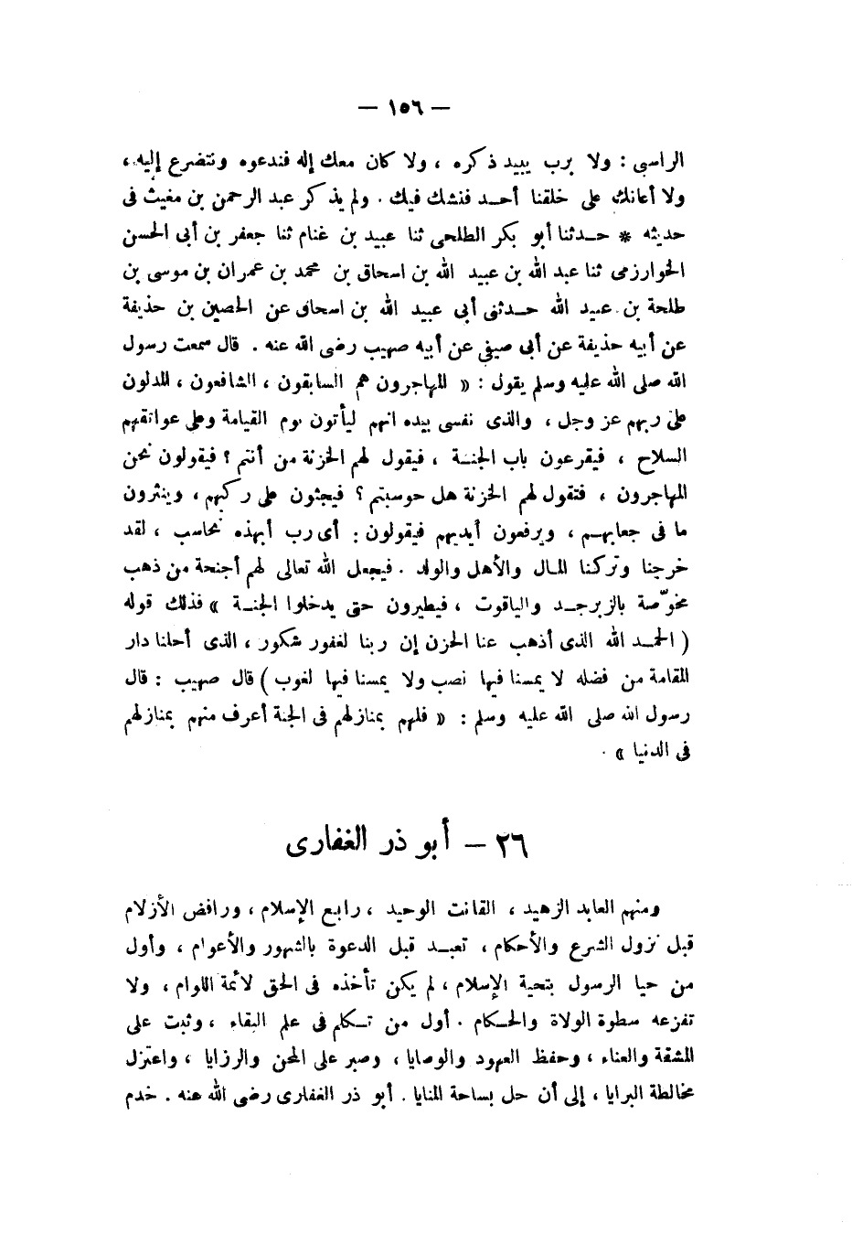 §أَبُو ذَرٍّ الْغِفَارِيُّ وَمِنْهُمُ الْعَابِدُ الزَّهِيدُ، الْقَانِتُ الْوَحِيدُ، رَابِعُ الْإِسْلَامِ، وَرَافِضُ الْأَزْلَامِ، قَبْلَ نُزُولِ الشَّرْعِ وَالْأَحْكَامِ، تَعَبَّدَ قَبْلَ الدَّعْوَةِ بِالشُّهُورِ وَالْأَعْوَامِ، وَأَوَّلُ مَنْ حَيَّا الرَّسُولَ بِتَحِيَّةِ الْإِسْلَامِ، لَمْ يَكُنْ تَأْخُذُهُ فِي الْحَقِّ لَائِمَةُ اللُّوَّامِ، وَلَا تُفْزِعُهُ سَطْوَةُ الْوُلَاةِ وَالْحُكَّامِ، أَوَّلُ مَنْ تَكَلَّمَ فِي عِلْمِ الْبَقَاءِ وَالْفَنَاءِ، وَثَبَتَ عَلَى الْمَشَقَّةِ وَالْعَنَاءِ، وَحَفِظَ الْعُهُوَدَ وَالْوَصَايَا، وَصَبَرَ عَلَى الْمِحَنِ وَالرَّزَايَا، وَاعْتَزَلَ مُخَالَطَةَ الْبَرَايَا، إِلَى أَنْ حَلَّ بِسَاحَةِ الْمَنَايَا. أَبُو ذَرٍّ الْغِفَارِيُّ رَضِيَ اللهُ عَنْهُ، خَدَمَ -[157]- الرَّسُولَ، وَتَعَلَّمَ الْأُصُولَ، وَنَبَذَ الْفُضُولَ. وَقَدْ قِيلَ: «إِنَّ التَّصَوُّفَ التَّأَلُّهُ وَالتَّدَلُّهُ، عَنْ غَلَبَاتِ التَّوَلُّهِ»