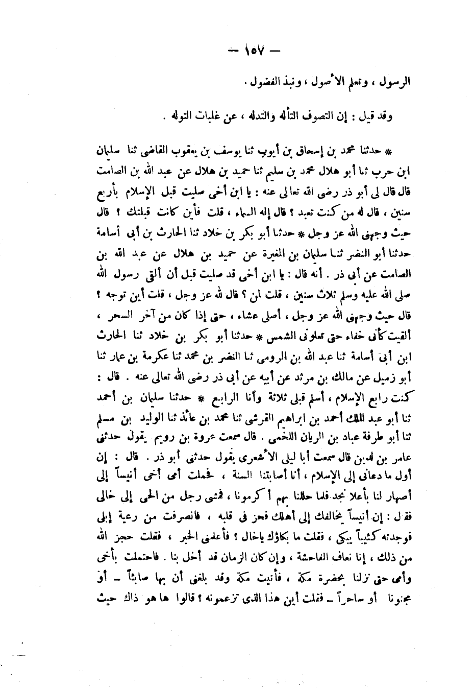 حَدَّثَنَا مُحَمَّدُ بْنُ إِسْحَاقَ بْنَ أَيُّوبَ، ثَنَا يُوسُفُ بْنُ يَعْقُوبَ الْقَاضِي، ثَنَا سُلَيْمَانُ بْنُ حَرْبٍ، ثَنَا أَبُو هِلَالٍ مُحَمَّدُ بْنُ سُلَيْمٍ، ثَنَا حُمَيْدُ بْنُ هِلَالٍ، عَنْ عَبْدِ اللهِ بْنِ الصَّامِتِ، قَالَ: قَالَ لِي أَبُو ذَرٍّ رَضِيَ اللهُ تَعَالَى عَنْهُ: «يَا ابْنَ أَخِي §صَلَّيْتُ قَبْلَ الْإِسْلَامِ بِأَرْبَعِ سِنِينَ»، قَالَ لَهُ: مَنْ كُنْتَ تَعْبُدُ؟ قَالَ: «إِلَهَ السَّمَاءِ»، قُلْتُ: فَأَيْنَ كَانَتْ قِبْلَتُكَ؟ قَالَ: «حَيْثُ وَجَّهَنِي اللهُ عَزَّ وَجَلَّ»