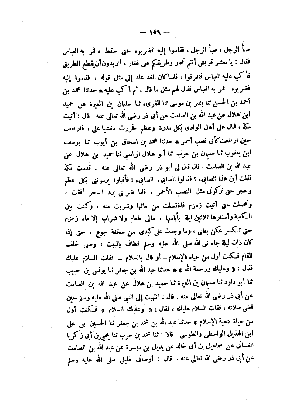 حَدَّثَنَا مُحَمَّدُ بْنُ إِسْحَاقَ بْنَ أَيُّوبَ، ثَنَا يُوسُفُ بْنُ يَعْقُوبَ، ثَنَا سُلَيْمَانُ بْنُ حَرْبٍ، ثَنَا أَبُو هِلَالٍ الرَّاسِبِيُّ، ثَنَا حُمَيْدُ بْنُ هِلَالٍ، عَنْ عَبْدِ اللهِ بْنِ الصَّامِتِ، قَالَ: قَالَ لِي أَبُو ذَرٍّ رَضِيَ اللهُ تَعَالَى عَنْهُ: قَدِمْتُ مَكَّةَ فَقُلْتُ: أَيْنَ هَذَا الصَّابِئُ؟ فَقَالُوا: الصَّابِئُ الصَّابِئُ فَأَقْبَلُوا يَرْمُونَنِي بِكُلِّ عَظْمٍ وَحَجَرٍ حَتَّى تَرَكُونِي مِثْلَ النُّصُبِ الْأَحْمَرِ، فَلَمَّا ضَرَبَنِي بَرْدُ السَّحَرِ أَفَقْتُ، وَتَحَمَّلْتُ حَتَّى أَتَيْتُ زَمْزَمَ فَاغْتَسَلْتُ مِنْ مَائِهَا وَشَرِبْتُ مِنْهُ، وَكُنْتُ بَيْنَ الْكَعْبَةِ وَأَسْتَارِهَا ثَلَاثِينَ لَيْلَةً بِأَيَّامِهَا، مَا لِي طَعَامٌ وَلَا شَرَابٌ إِلَّا مَاءَ زَمْزَمَ، حَتَّى تَكَسَّرَ عُكَنُ بَطْنِي وَمَا وَجَدْتُ عَلَى كَبِدِي مِنْ سُخْفَةِ جُوعٍ، حَتَّى إِذَا كَانَتْ ذَاتُ لَيْلَةٍ جَاءَ نَبِيُّ اللهِ صَلَّى اللهُ عَلَيْهِ وَسَلَّمَ فَطَافَ بِالْبَيْتِ وَصَلَّى خَلْفَ الْمَقَامِ، §فَكُنْتُ أَوَّلَ مَنْ حَيَّاهُ بِالْإِسْلَامِ - أَوْ قَالَ: بِالسَّلَامِ - فَقُلْتُ: السَّلَامُ عَلَيْكَ، فَقَالَ: «وَعَلَيْكَ وَرَحْمَةُ اللهِ»