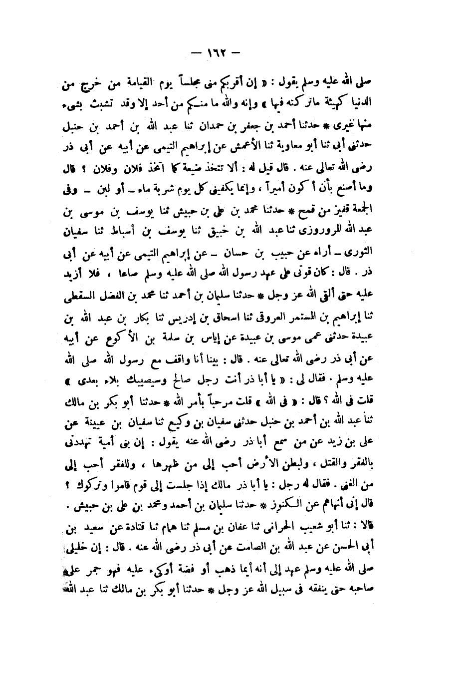 حَدَّثَنَا أَحْمَدُ بْنُ جَعْفَرِ بْنِ حَمْدَانَ، ثَنَا عَبْدُ اللهِ بْنُ أَحْمَدَ بْنِ حَنْبَلٍ، حَدَّثَنِي أَبِي، ثَنَا أَبُو مُعَاوِيَةَ، ثَنَا الْأَعْمَشُ، عَنْ إِبْرَاهِيمَ التَّيْمِيِّ، عَنْ أَبِيهِ، عَنْ أَبِي ذَرٍّ، رَضِيَ اللهُ تَعَالَى عَنْهُ، قَالَ: قِيلَ لَهُ: أَلَا تَتَّخِذُ ضَيْعَةً كَمَا اتَّخَذَ فُلَانٌ وَفُلَانٌ؟ قَالَ: «§وَمَا أَصْنَعُ بِأَنْ أَكُونَ أَمِيرًا؟ وَإِنَّمَا يَكْفِينِي كُلَّ يَوْمٍ شَرْبَةُ مَاءٍ أَوْ لَبَنٍ، وَفِي الْجُمُعَةِ قَفِيزٌ مِنْ قَمْحٍ»
