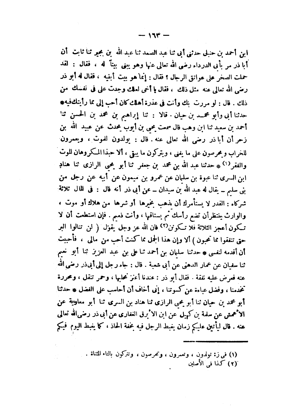 حَدَّثَنَا أَبُو مُحَمَّدِ بْنُ حَيَّانَ، ثَنَا أَبُو يَحْيَى الرَّازِيُّ، ثَنَا هَنَّادُ بْنُ السَّرِيِّ، ثَنَا أَبُو مُعَاوِيَةَ، عَنِ الْأَعْمَشِ، عَنْ سَلَمَةَ بْنِ كُهَيْلٍ، عَنِ ابْنِ الْأَبْرَقِ الْغِفَارِيِّ، عَنْ أَبِي ذَرٍّ، رَضِيَ اللهُ تَعَالَى عَنْهُ قَالَ: «§لَيَأْتِيَنَّ عَلَيْكُمْ زَمَانٌ يُغْبَطُ الرَّجُلِ فِيهِ بِخِفَّةِ الْحَاذِ كَمَا يُغْبَطُ الْيَوْمَ فِيكُمْ -[164]- أَبُو عَشْرَةَ»