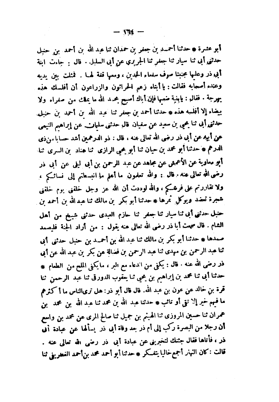 حَدَّثَنَا عَبْدُ اللهِ بْنُ مُحَمَّدٍ، ثَنَا عَبْدُ اللهِ بْنُ مُحَمَّدِ بْنِ عِمْرَانَ، ثَنَا حُسَيْنٌ الْمَرْوَزِيُّ، ثَنَا الْهَيْثَمُ بْنُ جَمِيلٍ، ثَنَا صَالِحٌ الْمُرِّيُّ، عَنْ مُحَمَّدِ بْنِ وَاسِعٍ، أَنَّ رَجُلًا مِنَ الْبَصْرَةِ رَكِبَ إِلَى أُمِّ ذَرٍّ بَعْدَ وَفَاةِ أَبِي ذَرٍّ يَسْأَلُهَا عَنْ عِبَادَةِ أَبِي ذَرٍّ، فَأَتَاهَا فَقَالَ: جِئْتُكَ لَتُخْبِرِينِي عَنْ عِبَادَةِ أَبِي ذَرٍّ رَضِيَ اللهُ تَعَالَى عَنْهُ، قَالَتْ: «§كَانَ النَّهَارُ أَجْمَعُ خَالِيًا يَتَفَكَّرُ»