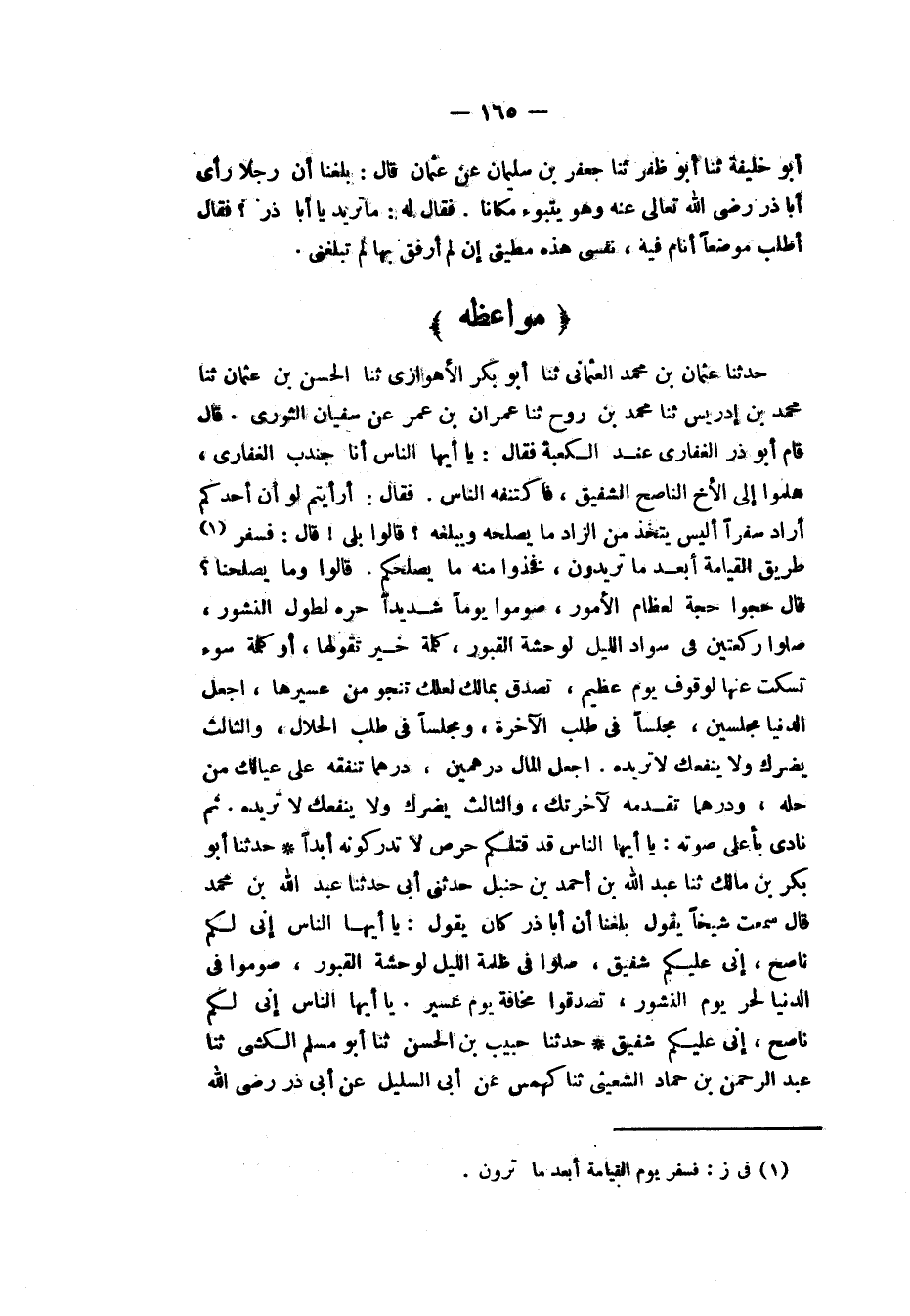 حَدَّثَنَا عُثْمَانُ بْنُ مُحَمَّدٍ الْعُثْمَانِيُّ، ثَنَا أَبُو بَكْرٍ الْأَهْوَازِيُّ، ثَنَا الْحَسَنُ بْنُ عُثْمَانَ، ثَنَا مُحَمَّدُ بْنُ إِدْرِيسَ، ثَنَا مُحَمَّدُ بْنُ رَوْحٍ، ثَنَا عِمْرَانُ بْنُ عُمَرَ، عَنْ سُفْيَانَ الثَّوْرِيِّ، قَالَ: قَامَ أَبُو ذَرٍّ الْغِفَارِيُّ عِنْدَ الْكَعْبَةِ فَقَالَ: يَا أَيُّهَا النَّاسُ أَنَا جُنْدُبٌ الْغِفَارِيُّ، هَلُمُّوا إِلَى الْأَخِ النَّاصِحِ الشَّفِيقِ، فَاكْتَنَفَهُ النَّاسُ، فَقَالَ: أَرَأَيْتُمْ لَوْ أَنَّ أَحَدَكُمْ أَرَادَ سَفَرًا، أَلَيْسَ يَتَّخِذُ مِنَ الزَّادِ لَا يُصْلِحُهُ وَيُبَلِّغُهُ؟ قَالُوا: بَلَى، قَالَ: فَسَفَرُ طَرِيقِ الْقِيَامَةِ أَبْعَدُ مَا تُرِيدُونَ، فَخُذُوا مِنْهُ مَا يُصْلِحُكُمْ، قَالُوا: وَمَا يُصْلِحُنَا؟ قَالَ: " §حُجُّوا حَجَّةً لِعِظَامِ الْأُمُورِ، صُومُوا يَوْمًا شَدِيدًا حَرُّهُ لِطُولِ النُّشُورِ، صَلُّوا رَكْعَتَيْنِ فِي سَوَّادِ اللَّيْلِ لِوَحْشَةِ الْقُبُورِ، كَلِمَةُ خَيْرٍ تَقُولُهَا أَوْ كَلِمَةُ سُوءٍ تَسْكُتُ عَنْهَا لِوقُوفِ يَوْمٍ عَظِيمٍ، تَصَدَّقْ بِمَالِكَ لَعَلَّكَ تَنْجُو مِنْ عَسِيرِهَا، اجْعَلِ الدُّنْيَا مَجْلِسَيْنِ: مَجْلِسًا فِي طَلَبِ الْآخِرَةِ، وَمَجْلِسًا فِي طَلَبِ الْحَلَالِ، وَالثَّالِثُ يَضُرُّكَ وَلَا يَنْفَعُكَ، لَا تُرِيدُهُ. اجْعَلِ الْمَالَ دِرْهَمَيْنِ: دِرْهَمًا تُنْفِقُهُ عَلَى عِيَالِكَ مِنْ حِلِّهِ، وَدِرْهَمًا تُقَدِّمُهُ لِآخِرَتِكَ، وَالثَّالِثُ يَضُرُّكَ وَلَا يَنْفَعُكَ، لَا تُرِيدُهُ. ثُمَّ نَادَى بِأَعْلَى صَوْتِهِ: يَا أَيُّهَا النَّاسُ قَدْ قَتَلَكُمْ حِرْصٌ لَا تُدْرِكُونَهُ أَبَدًا "