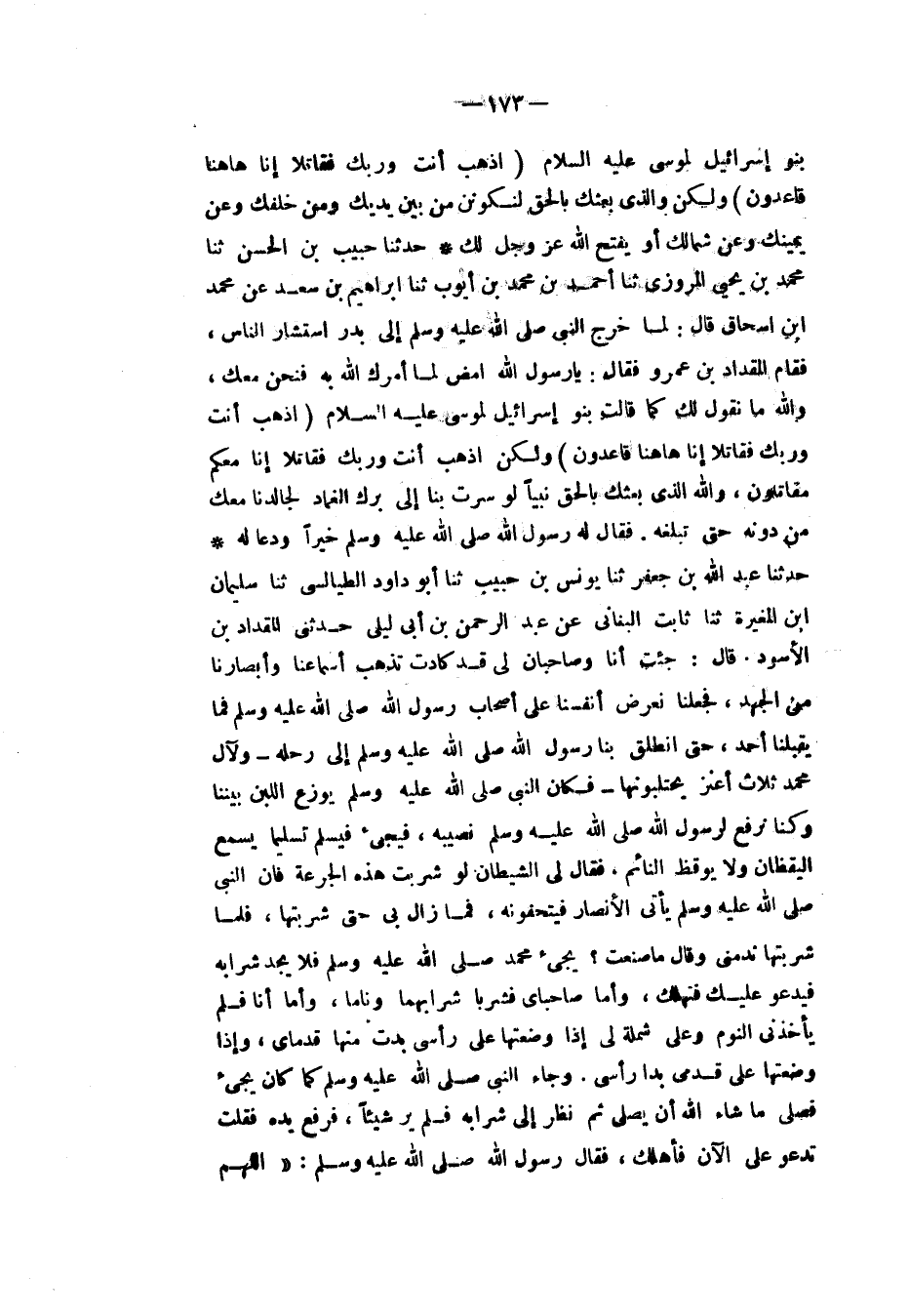 حَدَّثَنَا حَبِيبُ بْنُ الْحَسَنِ، ثَنَا مُحَمَّدُ بْنُ يَحْيَى الْمَرْوَزِيُّ، ثَنَا أَحْمَدُ بْنُ مُحَمَّدِ بْنِ أَيُّوبَ، ثَنَا إِبْرَاهِيمُ بْنُ سَعْدٍ، عَنْ مُحَمَّدِ بْنِ إِسْحَاقَ، قَالَ: لَمَّا خَرَجَ النَّبِيُّ صَلَّى اللهُ عَلَيْهِ وَسَلَّمَ إِلَى بَدْرٍ اسْتَشَارَ النَّاسَ، فَقَامَ الْمِقْدَادُ بْنُ عَمْرٍو فَقَالَ: يَا رَسُولَ اللهِ امْضِ لِمَا أَمَرَكَ اللهُ بِهِ فَنَحْنُ مَعَكَ، وَاللهِ مَا نَقُولُ لَكَ كَمَا قَالَتْ بَنُو إِسْرَائِيلَ لِمُوسَى عَلَيْهِ السَّلَامُ: اذْهَبْ أَنْتَ وَرَبُّكَ فَقَاتِلَا إِنَّا هَاهُنَا قَاعِدُونَ، وَلَكِنِ §اذْهَبْ أَنْتَ وَرَبُّكَ فَقَاتِلَا إِنَّا مَعَكُمْ مُقَاتِلُونَ، وَاللهِ الَّذِي بَعَثَكَ بِالْحَقِّ نَبِيًّا، لَوْ سِرْتَ بِنَا إِلَى بِرَكِ الْغِمَادِ لَجَالَدْنَا مَعَكَ مِنْ دُونِهِ حَتَّى تَبْلُغَهُ «فَقَالَ لَهُ رَسُولُ اللهِ صَلَّى اللهُ عَلَيْهِ وَسَلَّمَ خَيْرًا وَدَعَا لَهُ»