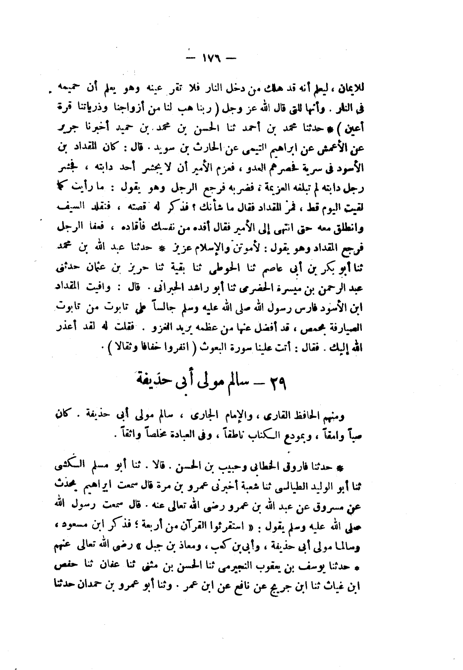 §سَالِمٌ مَوْلَى أَبِي حُذَيْفَةَ وَمِنْهُمُ الْحَافِظُ الْقَارِي، وَالْإِمَامُ الْجَارِي، سَالِمٌ مَوْلَى أَبِي حُذَيْفَةَ. كَانَ صَبًّا وَامِقًا، وَبِمُودَعِ الْكِتَابِ نَاطِقًا، وَفِي الْعِبَادَةِ مُخْلِصًا وَاثِقًا
