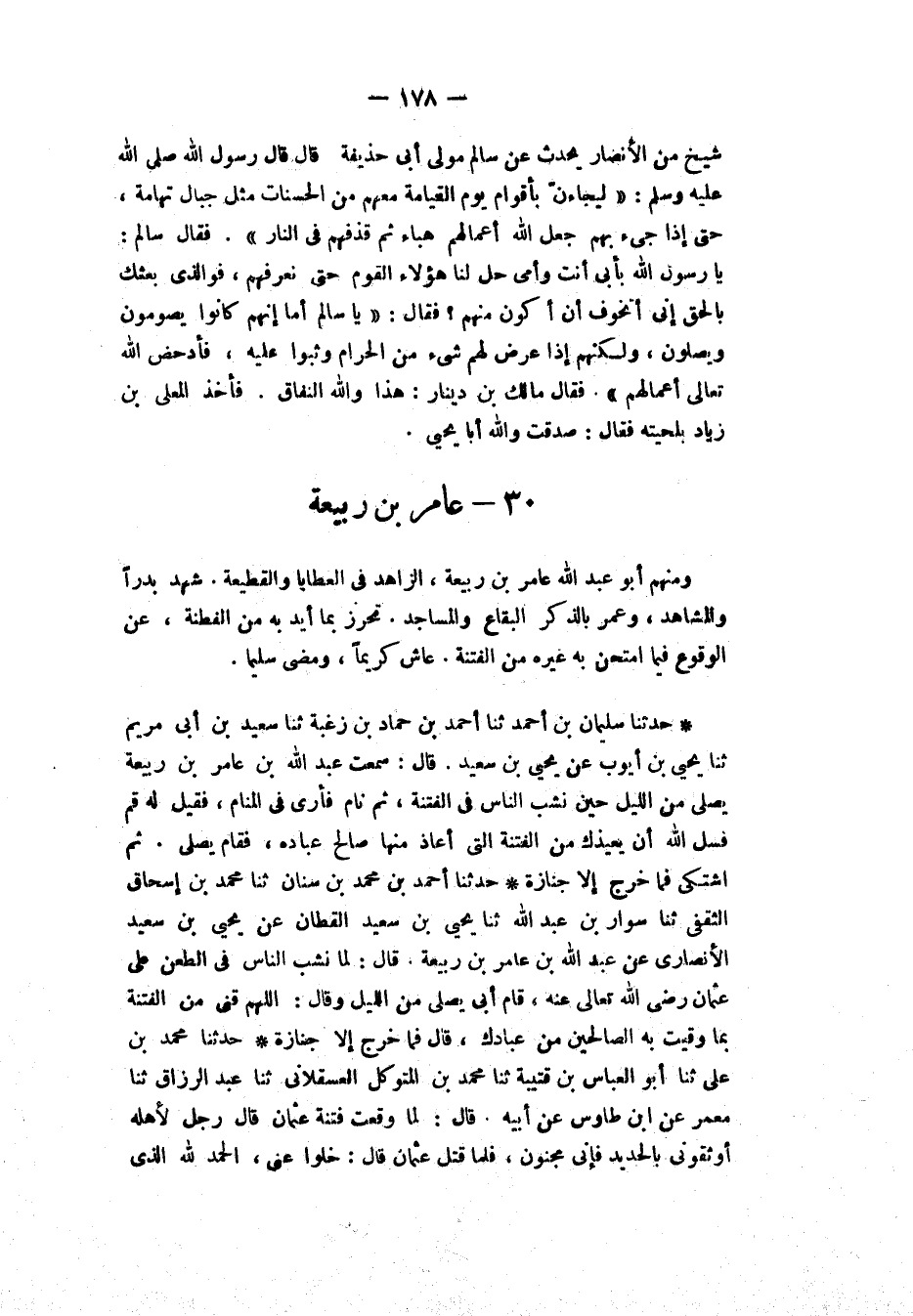 §عَامِرُ بْنُ رَبِيعَةَ وَمِنْهُمْ أَبُو عَبْدِ اللهِ عَامِرُ بْنُ رَبِيعَةَ، الزَّاهِدُ فِي الْعَطَايَا وَالْقَطِيعَةِ. شَهِدَ بَدْرًا وَالْمَشَاهِدَ، وَعَمَّرَ بِالذِّكْرِ الْبِقَاعَ وَالْمَسَاجِدَ، تَحَرَّزَ بِمَا أُيِّدَ بِهِ مِنَ الْفِطْنَةِ، عَنِ الْوُقُوعِ فِيمَا امْتُحِنَ بِهِ غَيْرُهُ مِنَ الْفِتْنَةِ، عَاشَ كَرِيمًا، وَمَضَى سَلِيمًا