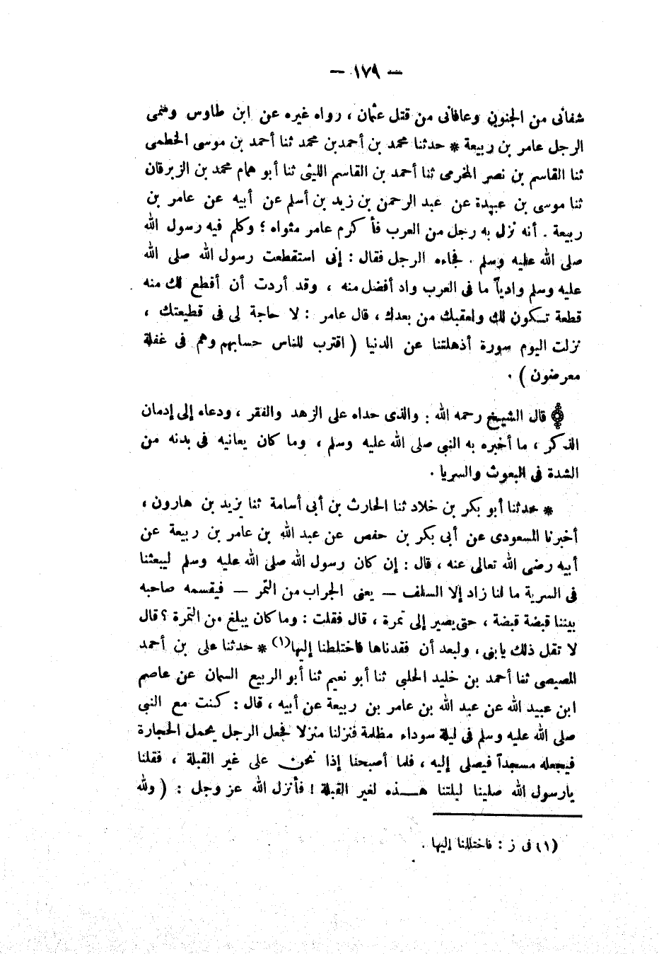 حَدَّثَنَا مُحَمَّدُ بْنُ أَحْمَدَ بْنِ مُحَمَّدٍ، ثَنَا أَحْمَدُ بْنُ مُوسَى الْخَطْمِيُّ، ثَنَا الْقَاسِمُ بْنُ نَصْرٍ الْمُخَرِّمِيُّ، ثَنَا أَحْمَدُ بْنُ الْقَاسِمِ اللَّيْثِيُّ، ثَنَا أَبُو هَمَّامٍ مُحَمَّدُ بْنُ الزِّبْرِقَانِ، ثَنَا مُوسَى بْنُ عُبَيْدَةَ، عَنْ عَبْدِ الرَّحْمَنِ بْنِ زَيْدِ بْنِ أَسْلَمَ، عَنْ أَبِيهِ، عَنْ عَامِرِ بْنِ رَبِيعَةَ، " أَنَّهُ نَزَلَ بِهِ رَجُلٌ مِنَ الْعَرَبِ، فَأَكْرَمَ عَامِرٌ مَثْوَاهُ وَكَلَّمَ فِيهِ رَسُولَ اللهِ صَلَّى اللهُ عَلَيْهِ وَسَلَّمَ، فَجَاءَهُ الرَّجُلُ فَقَالَ: إِنِّي اسْتَقْطَعْتُ رَسُولَ اللهِ صَلَّى اللهُ عَلَيْهِ وَسَلَّمَ وَادِيًا مَا فِي الْعَرَبِ وَادٍ أَفْضَلَ مِنْهُ، وَقَدْ أَرَدْتُ أَنْ أَقْطَعَ لَكَ مِنْهُ قِطْعَةً تَكُونُ لَكَ وَلِعَقِبِكَ مِنْ بَعْدِكَ، قَالَ عَامِرٌ: لَا حَاجَةَ لِي فِي قَطِيعَتِكَ، §نَزَلَتِ الْيَوْمَ سُورَةٌ أَذْهَلَتْنَا عَنِ الدُّنْيَا: اقْتَرَبَ لِلنَّاسِ حِسَابُهُمْ وَهُمْ فِي غَفْلَةٍ مُعْرِضُونَ " قَالَ الشَّيْخُ رَحِمَهُ اللهُ: وَالَّذِي حَدَاهُ عَلَى الزُّهْدِ وَالْفَقْرِ، وَدَعَاهُ إِلَى إِدْمَانِ الذِّكْرِ، مَا أَخْبَرَهُ بِهِ النَّبِيُّ صَلَّى اللهُ عَلَيْهِ وَسَلَّمَ، وَمَا كَانَ يُعَانِيهِ فِي بَدَنِهِ مِنَ الشِّدَّةِ فِي الْبُعُوثِ وَالسَّرَايَا