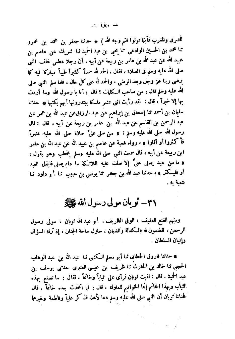 §ثَوْبَانُ مَوْلَى رَسُولِ اللهِ صَلَّى اللهُ عَلَيْهِ وَسَلَّمَ وَمِنْهُمُ الْقَنِعُ الْعَفِيفُ، الْوَفِيُّ الظَّرِيفُ، أَبُو عَبْدِ اللهِ ثَوْبَانُ مَوْلَى رَسُولِ الرَّحْمَنِ، الْمَضْمُونُ لَهُ بِالَكَفَالَةِ وَالضَّمَانِ، حُلُولَ سَاحَةِ الْجِنَانِ، إِذْ تَرَكَ السُّؤَالَ وَإِتْيَانَ السُّلْطَانِ