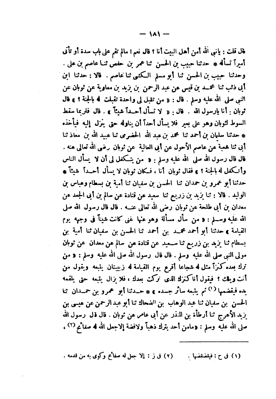 حَدَّثَنَا حَبِيبُ بْنُ الْحَسَنِ، ثَنَا عُمَرُ بْنُ حَفْصٍ، ثَنَا عَاصِمُ بْنُ عَلِيٍّ، وَحَدَّثَنَا حَبِيبُ بْنُ الْحَسَنِ، ثَنَا أَبُو مُسْلِمٍ الْكَشِّيُّ، ثَنَا عَاصِمٌ، قَالَا: حَدَّثَنَا ابْنُ أَبِي ذِئْبٍ، ثَنَا مُحَمَّدُ بْنُ قَيْسٍ، عَنْ عَبْدِ الرَّحْمَنِ بْنِ يَزِيدَ بْنِ مُعَاوِيَةَ، عَنْ ثَوْبَانَ، عَنِ النَّبِيِّ صَلَّى اللهُ عَلَيْهِ وَسَلَّمَ قَالَ: «مَنْ تَقَبَّلَ لِي وَاحِدَةً تَقَبَّلْتُ لَهُ بِالْجَنَّةِ»، قَالَ ثَوْبَانُ: أَنَا يَا رَسُولَ اللهِ، قَالَ: «§لَا تَسْأَلْ أَحَدًا شَيْئًا»، قَالَ: فَلَرُبَّمَا سَقَطَ السَّوْطُ لِثَوْبَانَ وَهُوَ عَلَى بَعِيرٍ فَلَا يَسْأَلُ أَحَدًا أَنْ يُنَاوِلَهُ حَتَّى يَنْزِلَ إِلَيْهِ فَيَأْخُذَهُ "
