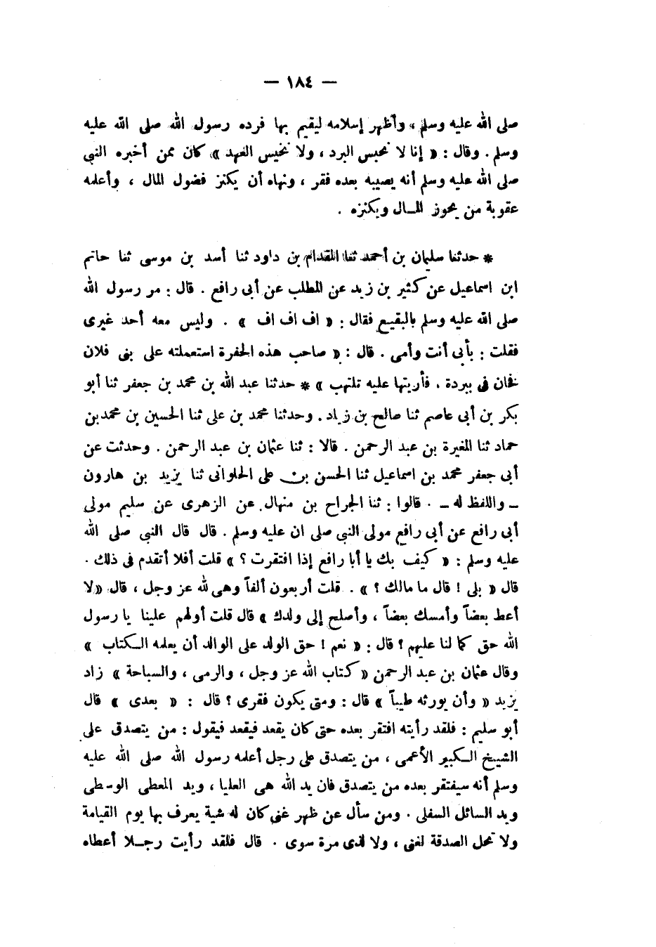 حَدَّثَنَا عَبْدُ اللهِ بْنُ مُحَمَّدِ بْنِ جَعْفَرٍ، ثَنَا أَبُو بَكْرِ بْنُ أَبِي عَاصِمٍ، ثَنَا صَالِحُ بْنُ زِيَادٍ، وَحَدَّثَنَا مُحَمَّدُ بْنُ عَلِيٍّ، ثَنَا الْحُسَيْنُ بْنُ مُحَمَّدِ بْنِ حَمَّادٍ، ثَنَا الْمُغِيرَةُ بْنُ عَبْدِ الرَّحْمَنِ، قَالَا: ثَنَا عُثْمَانُ بْنُ عَبْدِ الرَّحْمَنِ، وَحُدِّثْتُ عَنْ أَبِي جَعْفَرٍ مُحَمَّدِ بْنِ إِسْمَاعِيلَ، ثَنَا الْحَسَنُ بْنُ عَلِيٍّ الْحُلْوَانِيُّ، َثَنَا يَزِيدُ بْنُ هَارُونَ، وَاللَّفْظُ لَهُ، قَالُوا: ثَنَا الْجَرَّاحُ بْنُ مِنْهَالٍ، عَنِ الزُّهْرِيِّ، عَنْ سُلَيْمٍ، مَوْلَى أَبِي رَافِعٍ، عَنْ أَبِي رَافِعٍ، مَوْلَى النَّبِيِّ صَلَّى اللهُ عَلَيْهِ وَسَلَّمَ قَالَ: قَالَ النَّبِيُّ صَلَّى اللهُ عَلَيْهِ وَسَلَّمَ: «§كَيْفَ بِكَ يَا أَبَا رَافِعٍ إِذَا افْتَقَرْتَ؟»، قُلْتُ: أَفَلَا أَتَقَدَّمُ فِي ذَلِكَ؟ قَالَ: «بَلَى»، قَالَ: «مَا مَالُكَ؟» قُلْتُ: أَرْبَعُونَ أَلْفًا، وَهِيَ لِلَّهِ عَزَّ وَجَلَّ، قَالَ: «لَا، أَعْطِ بَعْضًا وَأَمْسِكْ بَعْضًا، وَأَصْلِحْ إِلَى وَلَدِكَ»، قَالَ: قُلْتُ: أَوَلَهُمْ عَلَيْنَا يَا رَسُولَ اللهِ حَقٌّ كَمَا لَنَا عَلَيْهِمْ؟ قَالَ: «نَعَمْ، حَقُّ الْوَلَدِ عَلَى الْوَالِدِ أَنْ يُعَلِّمَهُ الْكِتَابَ»، وَقَالَ عُثْمَانُ بْنُ عَبْدِ الرَّحْمَنِ: " كِتَابَ اللهِ عَزَّ وَجَلَّ، وَالرَّمْيَ وَالسِّبَاحَةَ. زَادَ يَزِيدُ: «وَأَنْ يُوَرِّثَهُ طَيِّبًا»، قَالَ: وَمَتَى يَكُونُ فَقْرِي؟ قَالَ: «بَعْدِي». قَالَ أَبُو سُلَيْمٍ: فَلَقَدْ رَأَيْتُهُ افْتَقَرَ بَعْدَهُ، حَتَّى كَانَ يَقْعُدُ، فَيَقْعُدُ فَيَقُولُ: مَنْ يَتَصَدَّقُ عَلَى الشَّيْخِ الْكَبِيرِ الْأَعْمَى؟ مَنْ يَتَصَدَّقُ عَلَى رَجُلٍ أَعْلَمَهُ رَسُولُ اللهِ صَلَّى اللهُ عَلَيْهِ وَسَلَّمَ أَنَّهُ سَيَفْتَقِرُ بَعْدَهُ؟ مَنْ يَتَصَدَّقُ فَإِنَّ يَدَ اللهِ هِيَ الْعُلْيَا، وَيَدَ الْمُعْطِي الْوُسْطَى، وَيَدَ السَّائِلِ السُّفْلَى، وَمَنْ سَأَلَ عَنْ ظَهْرِ غِنًى كَانَ لَهُ شَيْبَةٌ يُعْرَفُ بِهَا يَوْمَ الْقِيَامَةِ، وَلَا تَحِلُّ الصَّدَقَةُ لِغَنِيٍّ، وَلَا لِذِي مِرَّةٍ سَوِيٍّ؟ قَالَ: فَلَقَدْ رَأَيْتُ رَجُلًا أَعْطَاهُ