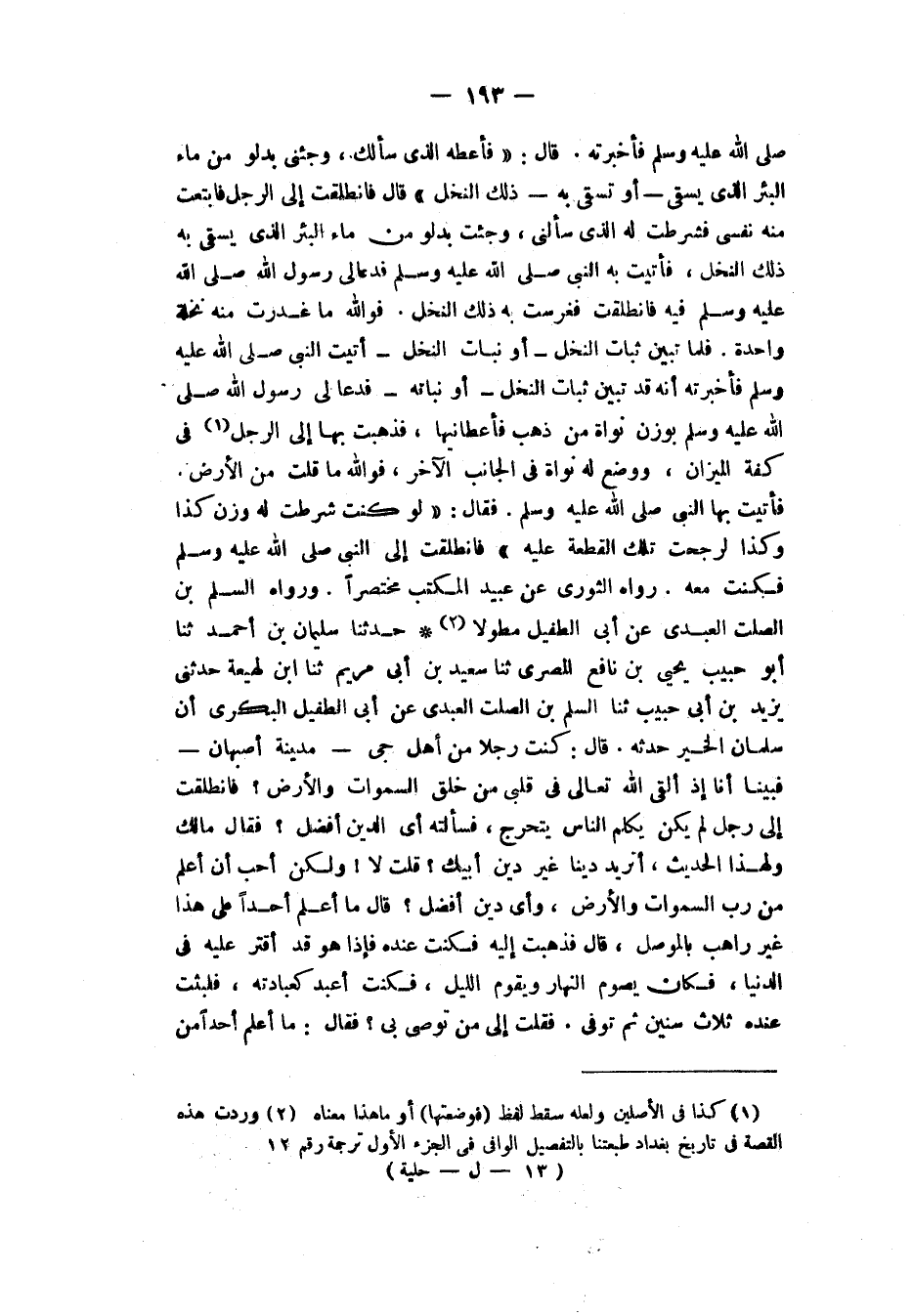 حَدَّثَنَا سُلَيْمَانُ بْنُ أَحْمَدَ، ثَنَا أَبُو حَبِيبٍ يَحْيَى بْنُ نَافِعٍ الْمِصْرِيُّ، ثَنَا سَعِيدُ بْنُ أَبِي مَرْيَمَ، ثَنَا ابْنُ لَهِيعَةَ، حَدَّثَنِي يَزِيدُ بْنُ أَبِي حَبِيبٍ، ثَنَا السَّلْمُ بْنُ الصَّلْتِ الْعَبْدِيُّ، عَنْ أَبِي الطُّفَيْلِ الْبَكْرِيِّ، أَنَّ سَلْمَانَ الْخَيْرِ، حَدَّثَهُ قَالَ: كُنْتُ رَجُلًا مِنْ أَهْلِ جَيٍّ - مَدِينَةُ أَصْبَهَانَ - فَبَيْنَا أَنَا إِذْ أَلْقَى اللهُ تَعَالَى فِي قَلْبِي مِنْ خَلْقِ السَّمَاوَاتِ وَالْأَرْضِ. فَانْطَلَقْتُ إِلَى رَجُلٍ لَمْ يَكُنْ يُكَلِّمُ النَّاسَ يَتَحَرَّجُ فَسَأَلْتُهُ: أَيُّ الدِّينِ أَفْضَلُ؟ فَقَالَ: مَا لَكَ وَلِهَذَا الْحَدِيثِ، أَتُرِيدُ دِينًا غَيْرَ دِينِ أَبِيكَ؟ قُلْتُ: لَا، وَلَكِنْ أُحِبُّ أَنْ أَعْلَمَ مَنْ رَبُّ السَّمَاوَاتِ وَالْأَرْضِ، وَأَيُّ دِينٍ أَفْضَلُ؟ قَالَ: مَا أَعْلَمُ أَحَدًا عَلَى هَذَا غَيْرَ رَاهِبٍ بِالْمَوْصِلِ، قَالَ: فَذَهَبْتُ إِلَيْهِ فَكُنْتُ عِنْدَهُ، فَإِذَا هُوَ قَدْ أُقْتِرَ عَلَيْهِ فِي الدُّنْيَا، فَكَانَ يَصُومُ النَّهَارَ وَيَقُومُ اللَّيْلَ، فَكُنْتُ أَعْبُدُ كَعِبَادَتِهِ، فَلَبِثْتُ عِنْدَهُ ثَلَاثَ سِنِينَ ثُمَّ تُوُفِّيَ، فَقُلْتُ: إِلَى مَنْ تُوصِي بِي؟ فَقَالَ: مَا أَعْلَمُ أَحَدًا مِنْ -[194]- أَهْلِ الْمَشْرِقِ عَلَى مَا أَنَا عَلَيْهِ، فَعَلَيْكَ بِرَاهِبٍ وَرَاءَ الْجَزِيرَةِ فَأَقْرِئْهُ مِنِّي السَّلَامَ. قَالَ: فَجِئْتُهُ فَأَقْرَأْتُهُ مِنْهُ السَّلَامَ وَأَخْبَرْتُهُ أَنَّهُ قَدْ تُوُفِّيَ، فَمَكَثْتُ أَيْضًا عِنْدَهُ ثَلَاثَ سِنِينَ ثُمَّ تُوُفِّيَ، فَقُلْتُ: إِلَى مَنْ تَأْمُرُنِي أَنْ أَذْهَبَ؟ قَالَ: مَا أَعْلَمُ أَحَدًا مِنْ أَهْلِ الْأَرْضِ عَلَى مَا أَنَا عَلَيْهِ غَيْرَ رَاهِبٍ بِعَمُّورِيَّةَ شَيْخٍ كَبِيرٍ، وَمَا أَرَى تَلْحَقُهُ أَمْ لَا، فَذَهَبْتُ إِلَيْهِ فَكُنْتُ عِنْدَهُ فَإِذَا رَجُلٌ مُوَسَّعٌ عَلَيْهِ، فَلَمَّا حَضَرَتْهُ الْوَفَاةُ قُلْتُ لَهُ: أَيْنَ تَأْمُرُنِي أَذْهَبُ؟ قَالَ: مَا أَعْلَمُ أَحَدًا مِنْ أَهْلِ الْأَرْضِ عَلَى مَا أَنَا عَلَيْهِ، وَلَكِنْ إِنْ أَدْرَكْتَ زَمَانًا تَسْمَعُ بِرَجُلٍ يَخْرُجُ مِنْ بَيْتِ إِبْرَاهِيمَ عَلَيْهِ السَّلَامُ - وَمَا أَرَاكُ تُدْرِكُهُ - وَقَدْ كُنْتُ أَرْجُو أَنْ أُدْرِكَهُ، فَإِنِ اسْتَطَعْتَ أَنْ تَكُونَ مَعَهُ فَافْعَلْ فَإِنَّهُ الدِّينُ، وَأَمَارَةُ ذَلِكَ أَنَّ قَوْمَهُ يَقُولُونَ: سَاحِرٌ مَجْنُونٌ كَاهِنٌ، وَأَنَّهُ يَأْكُلُ الْهَدِيَّةَ، وَلَا يَأْكُلُ الصَّدَقَةَ، وَأَنَّ عِنْدَ غُضْرُوفِ كَتِفِهِ خَاتَمَ النُّبُوَّةِ. قَالَ: فَبَيْنَا أَنَا كَذَلِكَ حَتَّى أَتَتْ عِيرٌ مِنْ نَحْوِ الْمَدِينَةِ، فَقُلْتُ: مَنْ أَنْتُمْ؟ قَالُوا: نَحْنُ مِنْ أَهْلِ الْمَدِينَةِ، وَنَحْنُ قَوْمٌ تُجَّارٌ نَعِيشُ بِتِجَارَتِنَا، وَلَكِنَّهُ قَدْ خَرَجَ رَجُلٌ مِنْ أَهْلِ بَيْتِ إِبْرَاهِيمَ فَقَدِمَ عَلَيْنَا، وَقَوْمُهُ يُقَاتِلُونَهُ وَقَدْ خَشِينَا أَنْ يَحُولَ بَيْنَنَا وَبَيْنَ تِجَارَتِنَا، وَلَكِنَّهُ قَدْ مَلَكَ الْمَدِينَةَ. قَالَ: فَقُلْتُ: مَا يَقُولُونَ فِيهِ؟ قَالَ: يَقُولُونَ: سَاحِرٌ مَجْنُونٌ كَاهِنٌ، فَقُلْتُ: هَذِهِ الْأَمَارَةُ، دُلُّونِي عَلَى صَاحِبِكُمْ، فَجِئْتُهُ فَقُلْتُ: تَحْمِلُنِي إِلَى الْمَدِينَةِ، فَقَالَ: مَا تُعْطِينِي؟ قُلْتُ: مَا أَجِدُ شَيْئًا أُعْطِيكَ غَيْرَ أَنِّي لَكَ عَبْدٌ، فَحَمَلَنِي، فَلَمَّا قَدِمْتُ جَعَلَنِي فِي نَخْلِهِ فَكُنْتُ أُسْقَى كَمَا يُسْقَى الْبَعِيرُ حَتَّى دَبُرَ ظَهْرِي وَصَدْرِي مِنْ ذَلِكَ، وَلَا أَجِدُ أَحَدًا يَفْقَهُ كَلَامِي حَتَّى جَاءَتْ عَجُوزٌ فَارِسِيَّةٌ تَسْقِي فَكَلَّمْتُهَا فَفَهِمَتْ 