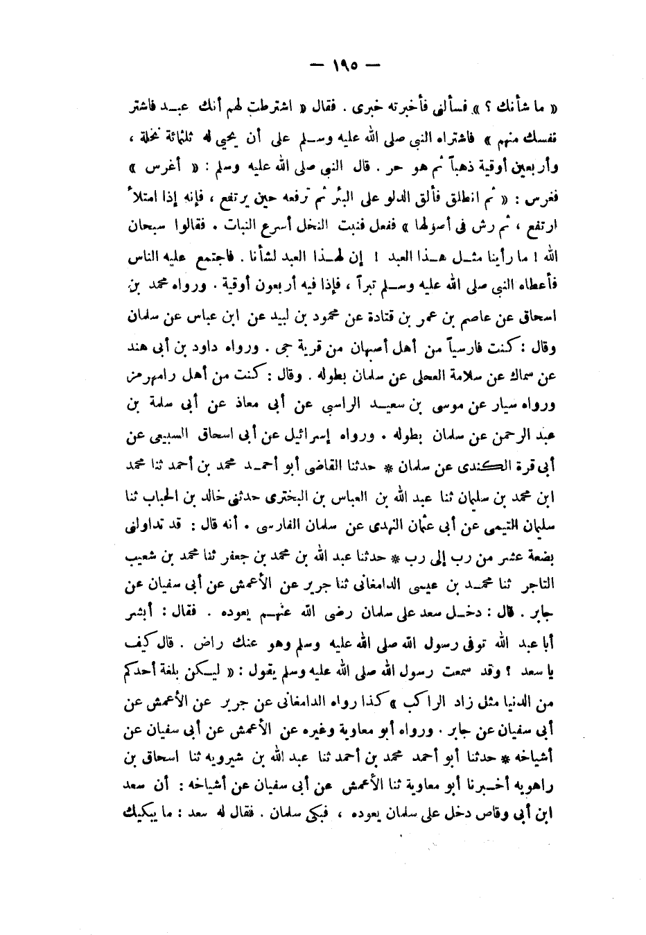 حَدَّثَنَا أَبُو أَحْمَدَ مُحَمَّدُ بْنُ أَحْمَدَ، ثَنَا عَبْدُ اللهِ بْنُ شِيرَوَيْهِ، ثَنَا إِسْحَاقُ بْنُ رَاهَوَيْهِ، أَخْبَرَنَا أَبُو مُعَاوِيَةَ، ثَنَا الْأَعْمَشُ، عَنْ أَبِي سُفْيَانَ، عَنْ أَشْيَاخِهِ، أَنَّ سَعْدَ بْنَ أَبِي وَقَّاصٍ، " دَخَلَ عَلَى سَلْمَانَ يَعُودُهُ فَبَكَى سَلْمَانُ، فَقَالَ لَهُ سَعْدٌ: مَا يُبْكِيكَ -[196]- تَلْقَى أَصْحَابَكَ وَتَرِدُ عَلَى رَسُولِ اللهِ صَلَّى اللهُ عَلَيْهِ وَسَلَّمَ الْحَوْضَ، وَتُوُفِّيَ رَسُولُ اللهِ صَلَّى اللهُ عَلَيْهِ وَسَلَّمَ وَهُوَ عَنْكَ رَاضٍ؟ فَقَالَ: مَا أَبْكِي جَزَعًا مِنَ الْمَوْتِ، وَلَا حِرْصًا عَلَى الدُّنْيَا، وَلَكِنَّ رَسُولَ اللهِ صَلَّى اللهُ عَلَيْهِ وَسَلَّمَ عَهِدَ إِلَيْنَا فَقَالَ: «§لِيَكُنْ بُلْغَةُ أَحَدِكُمْ مِنَ الدُّنْيَا كَزَادِ الرَّاكِبِ»، وَهَذِهِ الْأَسَاوِدُ حَوْلِي، وَإِنَّمَا حَوْلَهُ مَطْهَرَةٌ - أَوْ إِنْجَانَةٌ - وَنَحْوُهَا، فَقَالَ لَهُ سَعْدٌ: اعْهَدْ إِلَيْنَا عَهْدًا نَأْخُذْ بِهِ بَعْدَكَ، فَقَالَ لَهُ: اذْكُرْ رَبَّكَ عِنْدَ هَمِّكَ إِذَا هُمِمْتَ، وَعِنْدَ حُكْمِكَ إِذَا حَكَمْتَ، وَعِنْدَ يَدِكَ إِذَا قَسَمْتَ " رَوَاهُ مُوَرِّقٌ الْعِجْلِيُّ وَالْحَسَنُ الْبَصْرِيُّ، وَسَعِيدُ بْنُ الْمُسَيِّبِ وَعَامِرُ بْنُ عَبْدِ اللهِ، عَنْ سَلْمَانَ