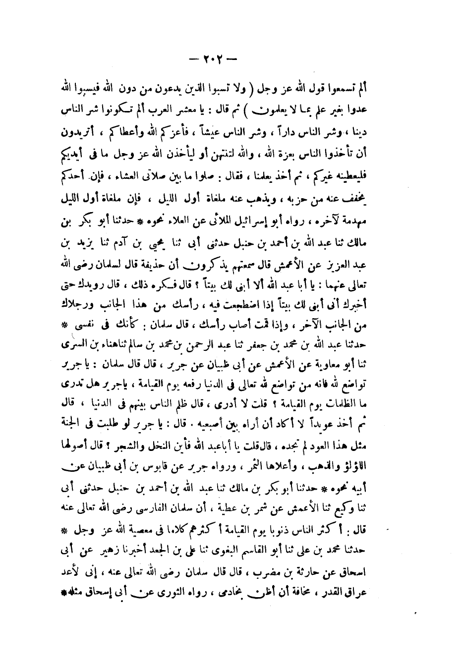 حَدَّثَنَا أَبُو بَكْرِ بْنُ مَالِكٍ، ثَنَا عَبْدُ اللهِ بْنُ أَحْمَدَ بْنِ حَنْبَلٍ، حَدَّثَنِي أَبِي، ثَنَا وَكِيعٌ، ثَنَا الْأَعْمَشُ، عَنْ شِمْرِ بْنِ عَطِيَّةَ، أَنَّ سَلْمَانَ الْفَارِسِيَّ، رَضِيَ اللهُ تَعَالَى عَنْهُ قَالَ: «§أَكْثَرُ النَّاسِ ذُنُوبًا يَوْمَ الْقِيَامَةِ أَكْثَرُهُمْ كَلَامًا فِي مَعْصِيَةِ اللهِ عَزَّ وَجَلَّ»