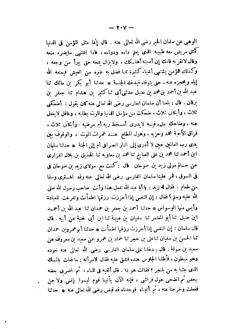 حَدَّثَنَا أَبُو بَكْرِ بْنُ مَالِكٍ، ثَنَا عَبْدُ اللهِ بْنُ أَحْمَدَ بْنِ مُحَمَّدِ بْنِ حَنْبَلٍ، حَدَّثَنِي أَبِي، ثَنَا كَثِيرُ بْنُ هِشَامٍ، ثَنَا جَعْفَرُ بْنُ بُرْقَانَ، قَالَ: بَلَغَنَا أَنَّ سَلْمَانَ الْفَارِسِيَّ، رَضِيَ اللهُ تَعَالَى عَنْهُ كَانَ يَقُولُ: " أَضْحَكَنِي ثَلَاثٌ، وَأَبْكَانِي ثَلَاثٌ: §ضَحِكْتُ مِنْ مُؤَمَّلِ الدُّنْيَا وَالْمَوْتُ يَطْلُبُهُ، وَغَافِلٍ لَا يُغْفَلُ عَنْهُ، وَضَاحِكٍ مِلْءَ فِيهِ لَا يَدْرِي أَمُسْخِطٌ رَبَّهُ أَمْ مُرْضِيهِ. وَأَبْكَانِي ثَلَاثٌ: فِرَاقُ الْأَحِبَّةِ مُحَمَّدٍ وَحِزْبِهِ، وَهَوْلُ الْمَطْلَعِ عِنْدَ غَمَرَاتِ الْمَوْتِ، وَالْوُقُوفُ بَيْنَ يَدَيْ رَبِّ الْعَالَمِينَ حِينَ لَا أَدْرِي إِلَى النَّارِ انْصِرَافِي أَمْ إِلَى الْجَنَّةِ "