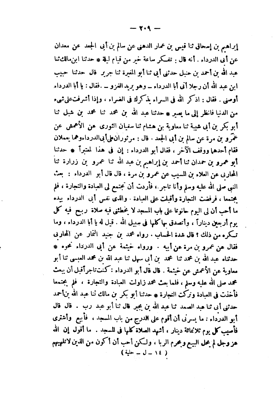 حَدَّثَنَا أَبُو عَمْرِو بْنُ حَمْدَانَ، ثَنَا أَحْمَدُ بْنُ إِبْرَاهِيمَ بْنِ عَبْدِ اللهِ، ثَنَا عَمْرُو بْنُ زُرَارَةَ، ثَنَا الْمُحَارِبِيُّ، عَنِ الْعَلَاءِ بْنِ الْمُسَيِّبِ، عَنْ عَمْرِو بْنِ مُرَّةَ، قَالَ: قَالَ أَبُو الدَّرْدَاءِ: «بُعِثَ النَّبِيُّ صَلَّى اللهُ عَلَيْهِ وَسَلَّمَ وَأَنَا تَاجِرٌ، فَأَرَدْتُ أَنْ تَجْتَمِعَ لِيَ الْعِبَادَةُ وَالتِّجَارَةُ، فَلَمْ يَجْتَمِعَا، §فَرَفَضْتُ التِّجَارَةَ وَأَقْبَلْتُ عَلَى الْعِبَادَةِ، وَالَّذِي نَفْسُ أَبِي الدَّرْدَاءِ بِيَدِهِ مَا أُحِبُّ أَنَّ لِيَ الْيَوْمَ حَانُوتًا عَلَى بَابِ الْمَسْجِدِ لَا يُخْطِئُنِي فِيهِ صَلَاةٌ أَرْبَحُ فِيهِ كُلَّ يَوْمٍ أَرْبَعِينَ دِينَارًا وَأَتَصَدَّقُ بِهَا كُلِّهَا فِي سَبِيلِ اللهِ». قِيلَ لَهُ: يَا أَبَا الدَّرْدَاءِ، وَمَا تَكْرَهُ مِنْ ذَلِكَ؟ قَالَ: «شِدَّةُ الْحِسَابِ» رَوَاهُ مُحَمَّدُ بْنُ جُنَيْدٍ التَّمَّارُ، عَنِ الْمُحَارِبِيِّ، فَقَالَ: عَنْ عَمْرِو بْنِ مُرَّةَ، عَنْ أَبِيهِ وَرَوَاهُ خَيْثَمَةُ، عَنْ أَبِي الدَّرْدَاءِ، نَحْوَهُ