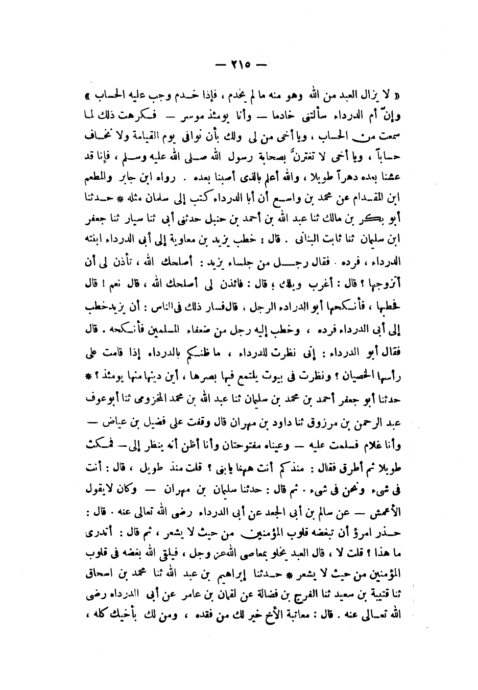 حَدَّثَنَا أَبُو جَعْفَرٍ أَحْمَدُ بْنُ مُحَمَّدِ بْنِ سُلَيْمَانَ، ثَنَا عَبْدُ اللهِ بْنُ مُحَمَّدٍ الْمَخْزُومِيُّ، ثَنَا أَبُو عَوْفٍ عَبْدُ الرَّحْمَنِ بْنُ مَرْزُوقٍ، ثَنَا دَاوُدُ بْنُ مِهْرَانَ، قَالَ: " وَقَفْتُ عَلَى فُضَيْلِ بْنِ عِيَاضٍ، وَأَنَا غُلَامٌ، فَسَلَّمْتُ عَلَيْهِ، وَعَيْنَاهُ مَفْتُوحَتَانِ، وَأَنَا أَظُنُّ، أَنَّهُ يَنْظُرُ إِلَيَّ، فَمَكَثَ طَوِيلًا ثُمَّ أَطْرَقَ فَقَالَ: مُنْذُ كَمْ أَنْتَ هَهُنَا يَا بُنَيَّ؟ قُلْتُ: مُنْذُ طَوِيلٍ، قَالَ: أَنْتَ فِي شَيْءٍ، وَنَحْنُ فِي شَيْءٍ، ثُمَّ قَالَ: حَدَّثَنَا سُلَيْمَانُ بْنُ مِهْرَانَ - وَكَانَ لَا يَقُولُ: الْأَعْمَشَ - عَنْ سَالِمِ بْنِ أَبِي الْجَعْدِ، عَنْ أَبِي الدَّرْدَاءِ رَضِيَ اللهُ تَعَالَى عَنْهُ قَالَ: «§حَذَرَ امْرُؤٌ أَنْ تُبْغِضَهُ قُلُوبُ الْمُؤْمِنِينَ مِنْ حَيْثُ لَا يَشْعُرُ»، ثُمَّ قَالَ: «أَتَدْرِي مَا هَذَا؟» قُلْتُ: لَا، قَالَ: «الْعَبْدُ يَخْلُو بِمَعَاصِي اللهِ عَزَّ وَجَلَّ فَيُلْقِي اللهُ بُغْضَهُ فِي قُلُوبِ الْمُؤْمِنِينَ مِنْ حَيْثُ لَا يَشْعُرُ»