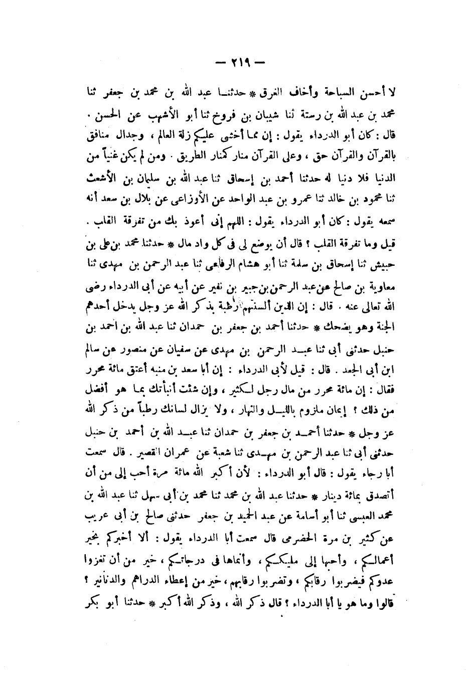 حَدَّثَنَا أَحْمَدُ بْنُ جَعْفَرِ بْنِ حَمْدَانَ، ثَنَا عَبْدُ اللهِ بْنُ أَحْمَدَ بْنِ حَنْبَلٍ، حَدَّثَنِي أَبِي، ثَنَا عَبْدُ الرَّحْمَنِ بْنُ مَهْدِيٍّ، عَنْ سُفْيَانَ، عَنْ مَنْصُورٍ، عَنْ سَالِمِ بْنِ أَبِي الْجَعْدِ، قَالَ: قِيلَ لِأَبِي الدَّرْدَاءِ: إِنَّ أَبَا سَعْدِ بْنَ مُنَبِّهٍ أَعْتَقَ مِائَةَ مُحَرَّرٍ فَقَالَ: «إِنَّ مِائَةَ مُحَرَّرٍ مِنْ مَالِ رَجُلٍ لَكَثِيرٌ، وَإِنْ شِئْتَ أَنْبَأْتُكَ بِمَا هُوَ أَفْضَلُ مِنْ ذَلِكَ، §إِيمَانٌ مَلْزُومٌ بِاللَّيْلِ وَالنَّهَارِ، وَلَا يَزَالُ لِسَانُكَ رَطْبًا مِنْ ذِكْرِ اللهِ عَزَّ وَجَلَّ»