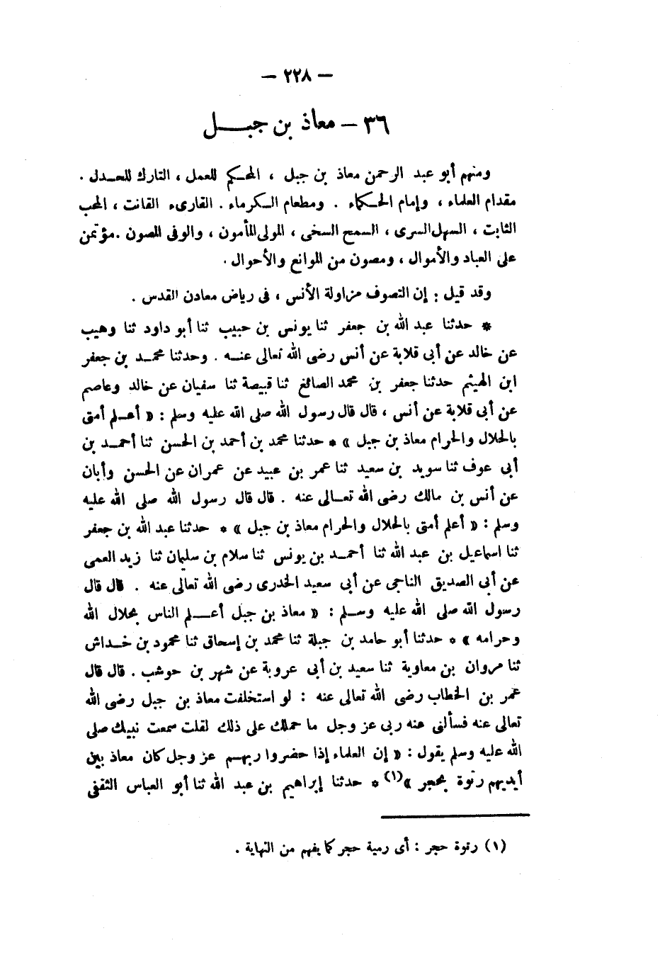 §مُعَاذُ بْنُ جَبَلٍ وَمِنْهُمْ أَبُو عَبْدِ الرَّحْمَنِ مُعَاذُ بْنُ جَبَلٍ، الْمُحْكِمُ لِلْعَمَلِ، التَّارِكُ لِلْجَدَلِ، مِقْدَامُ الْعُلَمَاءِ، وَإِمَامُ الْحُكَمَاءِ، وَمِطْعَامُ الْكُرَمَاءِ، الْقَارِئُ الْقَانِتُ، الْمُحِبُّ الثَّابِتُ، السَّهْلُ السَّرِيُّ، السَّمْحُ السَّخِيُّ، الْمَوْلَى الْمَأْمُونُ، وَالْوَفِيُّ الْمَصُونُ، مُؤْتَمَنٌ عَلَى الْعِبَادِ وَالْأَمْوَالِ، وَمَصُونٌ مِنَ الْمَوَانِعِ وَالْأَحْوَالِ. وَقَدْ قِيلَ: «إِنَّ التَّصَوُّفَ مُزَاوَلَةُ الْأُنْسِ، فِي رِيَاضِ مَعَادِنِ الْقُدُسِ».