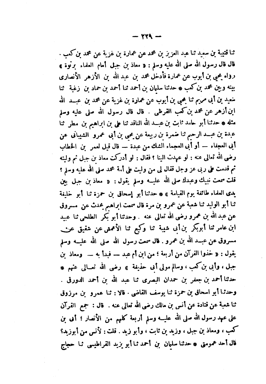حَدَّثَنَا سُلَيْمَانُ بْنُ أَحْمَدَ، ثَنَا أَبُو يَزِيدٍ الْقَرَاطِيسِيُّ، ثَنَا حَجَّاجُ -[230]- بْنُ إِبْرَاهِيمَ الْأَزْرَقُ، ثَنَا عُبَيْدُ اللهِ بْنُ عَمْرٍو، عَنْ عَبْدِ الْمَلِكِ بْنِ عُمَيْرٍ، عَنْ أَبِي الْأَحْوَصِ، وَغَيْرِهِ، عَنْ عَبْدِ اللهِ بْنِ مَسْعُودٍ، رَضِيَ اللهُ تَعَالَى عَنْهُ. وَحَدَّثَنَا أَحْمَدُ بْنُ مُحَمَّدِ بْنِ سِنَانٍ، ثَنَا مُحَمَّدُ بْنُ إِسْحَاقَ السَّرَّاجُ، ثَنَا سُفْيَانُ بْنُ وَكِيعٍ، ثَنَا ابْنُ عُلَيَّةَ، عَنْ مَنْصُورِ بْنِ عَبْدِ الرَّحْمَنِ، عَنِ الشَّعْبِيِّ، قَالَ: حَدَّثَنِي فَرْوَةُ بْنُ نَوْفَلٍ الْأَشْجَعِيُّ، قَالَ: قَالَ ابْنُ مَسْعُودٍ رَضِيَ اللهُ تَعَالَى عَنْهُ: «إِنَّ §مُعَاذَ بْنَ جَبَلٍ رَضِيَ اللهُ تَعَالَى عَنْهُ كَانَ أُمَّةً قَانِتًا لِلَّهِ حَنِيفًا» فَقِيلَ: إِنَّ إِبْرَاهِيمَ كَانَ أُمَّةً قَانِتًا لِلَّهِ حَنِيفًا، فَقَالَ: «مَا نَسِيتُ، هَلْ تَدْرِي مَا الْأُمَّةُ؟ وَمَا الْقَانِتُ؟» فَقُلْتُ: اللهُ أَعْلَمُ، فَقَالَ: «الْأُمَّةُ الَّذِي يُعَلِّمُ النَّاسَ الْخَيْرَ، وَالْقَانِتُ الْمُطِيعُ لِلَّهِ وَلِلرَّسُولِ، وَكَانَ مُعَاذُ يُعَلِّمُ النَّاسَ الْخَيْرَ، وَمُطِيعًا لِلَّهِ وَلِرَسُولِهِ»