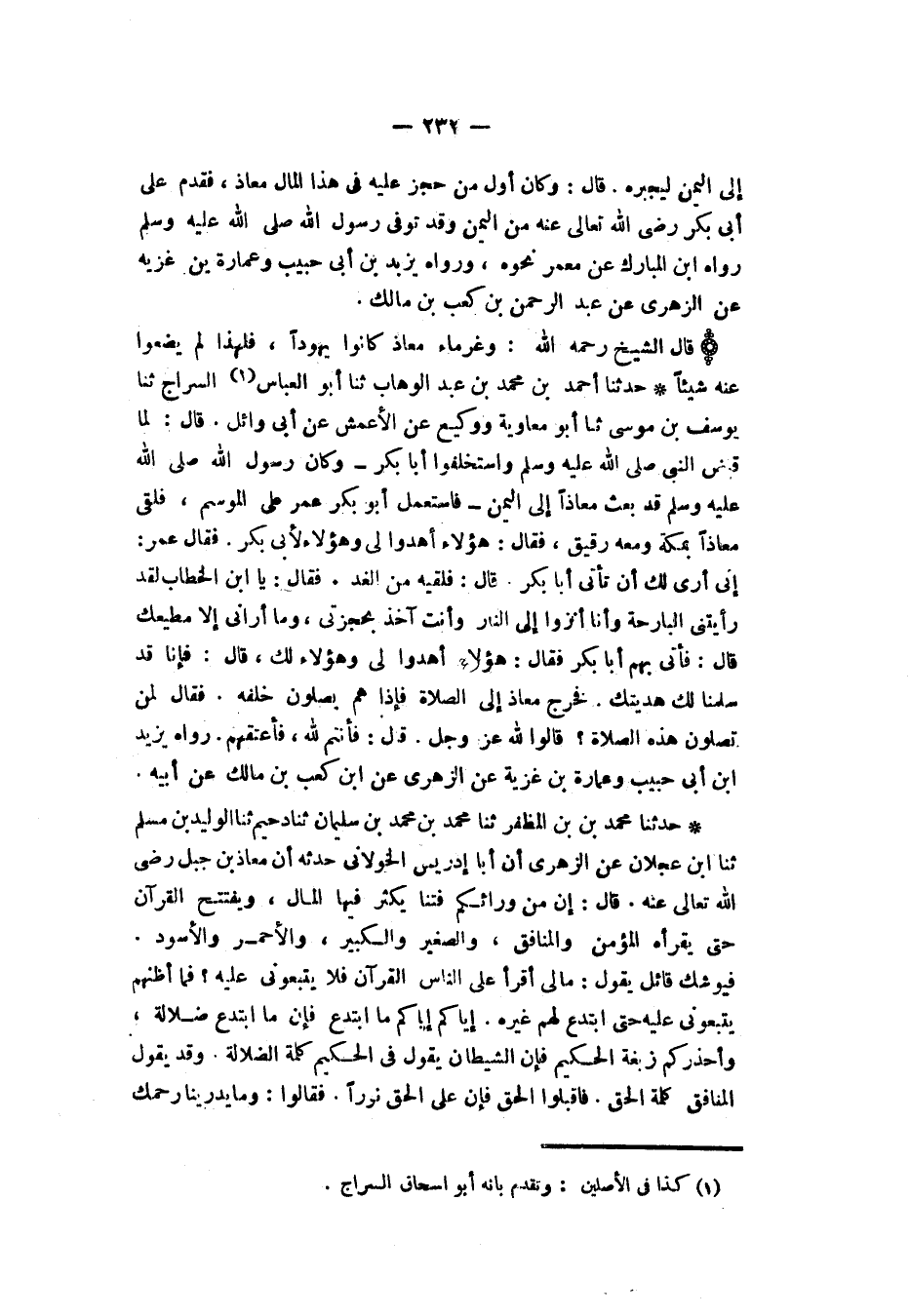 حَدَّثَنَا أَحْمَدُ بْنُ مُحَمَّدِ بْنِ عَبْدِ الْوَهَّابِ، ثَنَا أَبُو الْعَبَّاسِ السَّرَّاجُ، ثَنَا يُوسُفُ بْنُ مُوسَى، ثَنَا أَبُو مُعَاوِيَةَ، وَوَكِيعٌ، عَنِ الْأَعْمَشِ، عَنْ أَبِي وَائِلٍ، قَالَ: لَمَّا قُبِضَ النَّبِيُّ صَلَّى اللهُ عَلَيْهِ وَسَلَّمَ وَاسْتَخْلَفُوا أَبَا بَكْرٍ، وَكَانَ رَسُولُ اللهِ صَلَّى اللهُ عَلَيْهِ وَسَلَّمَ قَدْ بَعَثَ مُعَاذًا إِلَى الْيَمَنِ، فَاسْتَعْمَلَ أَبُو بَكْرٍ عُمَرَ عَلَى الْمَوْسِمِ، فَلَقِيَ مُعَاذًا بِمَكَّةَ وَمَعَهُ رَقِيقٌ، فَقَالَ: هَؤُلَاءِ أُهْدُوا إِلَيَّ، وَهَؤُلَاءِ لِأَبِي بَكْرٍ، فَقَالَ عُمَرُ: إِنِّي أَرَى لَكَ أَنْ تَأْتِيَ أَبَا بَكْرِ، قَالَ: فَلَقِيَهُ مِنَ الْغَدِ فَقَالَ: يَا ابْنَ الْخَطَّابِ لَقَدْ رَأَيْتُنِي الْبَارِحَةَ وَأَنَا أَنْزُو إِلَى النَّارِ، وَأَنْتَ آخِذٌ بِحُجْزَتِي، وَمَا أُرَانِي إِلَّا مُطِيعُكَ، قَالَ: فَأَتَى بِهِمْ أَبَا بَكْرٍ فَقَالَ: هَؤُلَاءِ أُهْدُوا لِي، وَهَؤُلَاءِ لَكَ، قَالَ: فَإِنَّا قَدْ سَلَّمْنَا لَكَ هَدِيَّتَكَ، فَخَرَجَ مُعَاذٌ إِلَى الصَّلَاةِ، فَإِذَا هُمْ يُصَلُّونَ خَلْفَهُ، فَقَالَ: «§لِمَنْ تُصَلُّونَ هَذِهِ الصَّلَاةَ؟» قَالُوا: لِلَّهِ عَزَّ وَجَلَّ، قَالَ: فَأَنْتُمْ لِلَّهِ، فَأَعْتَقَهُمْ " رَوَاهُ يَزِيدُ بْنُ أَبِي حَبِيبٍ، وَعُمَارَةُ بْنُ غَزِيَّةَ، عَنِ الزُّهْرِيِّ، عَنِ ابْنِ كَعْبِ بْنِ مَالِكٍ، عَنْ أَبِيهِ