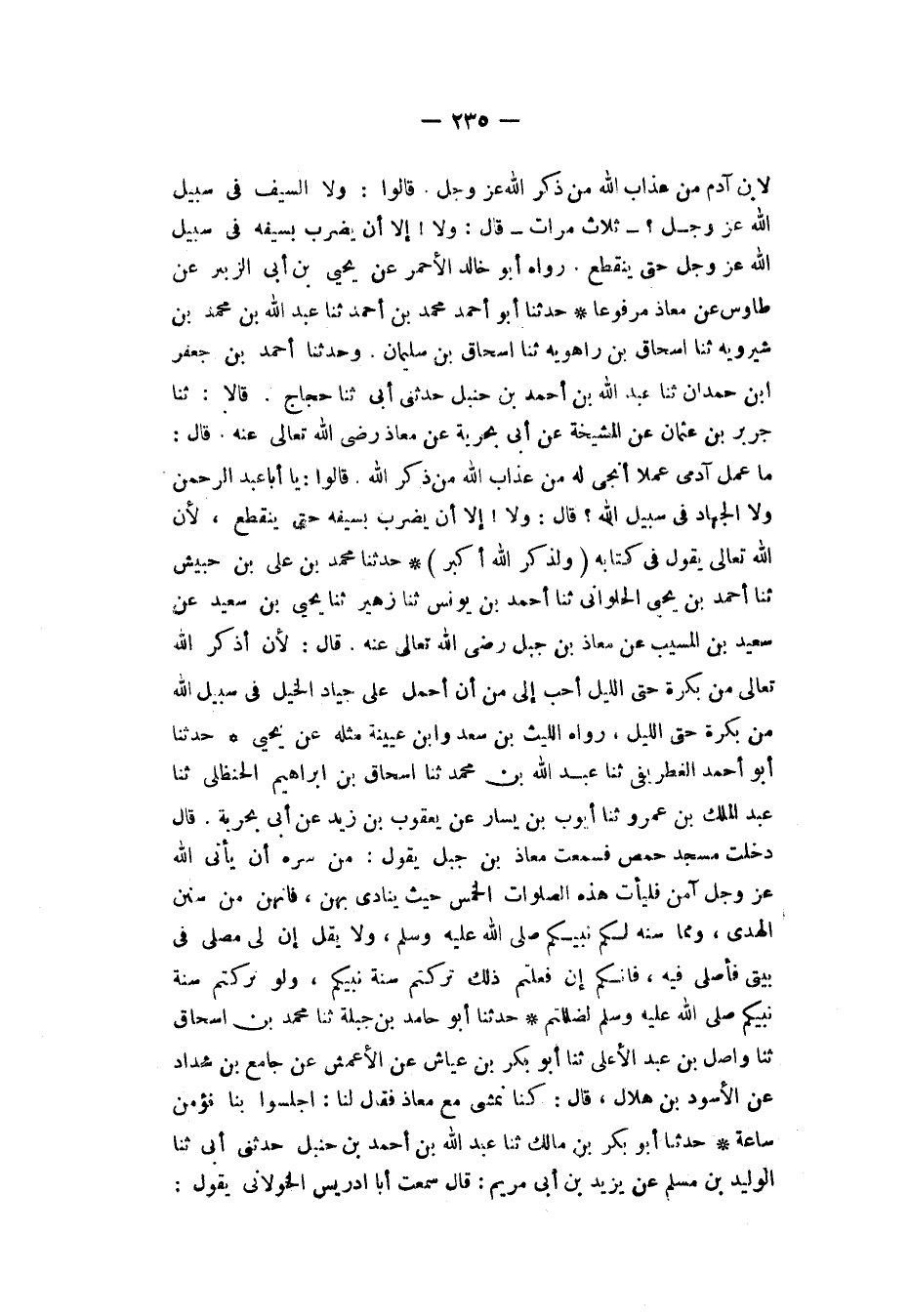 حَدَّثَنَا مُحَمَّدُ بْنُ عَلِيِّ بْنِ حُبَيْشٍ، ثَنَا أَحْمَدُ بْنُ يَحْيَى الْحُلْوَانِيُّ، ثَنَا أَحْمَدُ بْنُ يُونُسَ، ثَنَا زُهَيْرٌ، ثَنَا يَحْيَى بْنُ سَعِيدٍ، عَنْ سَعِيدِ بْنِ الْمُسَيِّبِ، عَنْ مُعَاذِ بْنِ جَبَلٍ، رَضِيَ اللهُ تَعَالَى عَنْهُ قَالَ: «§لَأَنْ أَذْكُرَ اللهَ تَعَالَى مِنْ بُكْرَةٍ حَتَّى اللَّيْلِ أَحَبُّ إِلَيَّ مِنْ أَنْ أَحْمِلَ عَلَى جِيَادِ الْخَيْلِ فِي سَبِيلِ اللهِ مِنْ بُكْرَةٍ حَتَّى اللَّيْلِ» رَوَاهُ اللَّيْثُ بْنُ سَعْدٍ، وَابْنُ عُيَيْنَةَ مِثْلَهُ عَنْ يَحْيَى