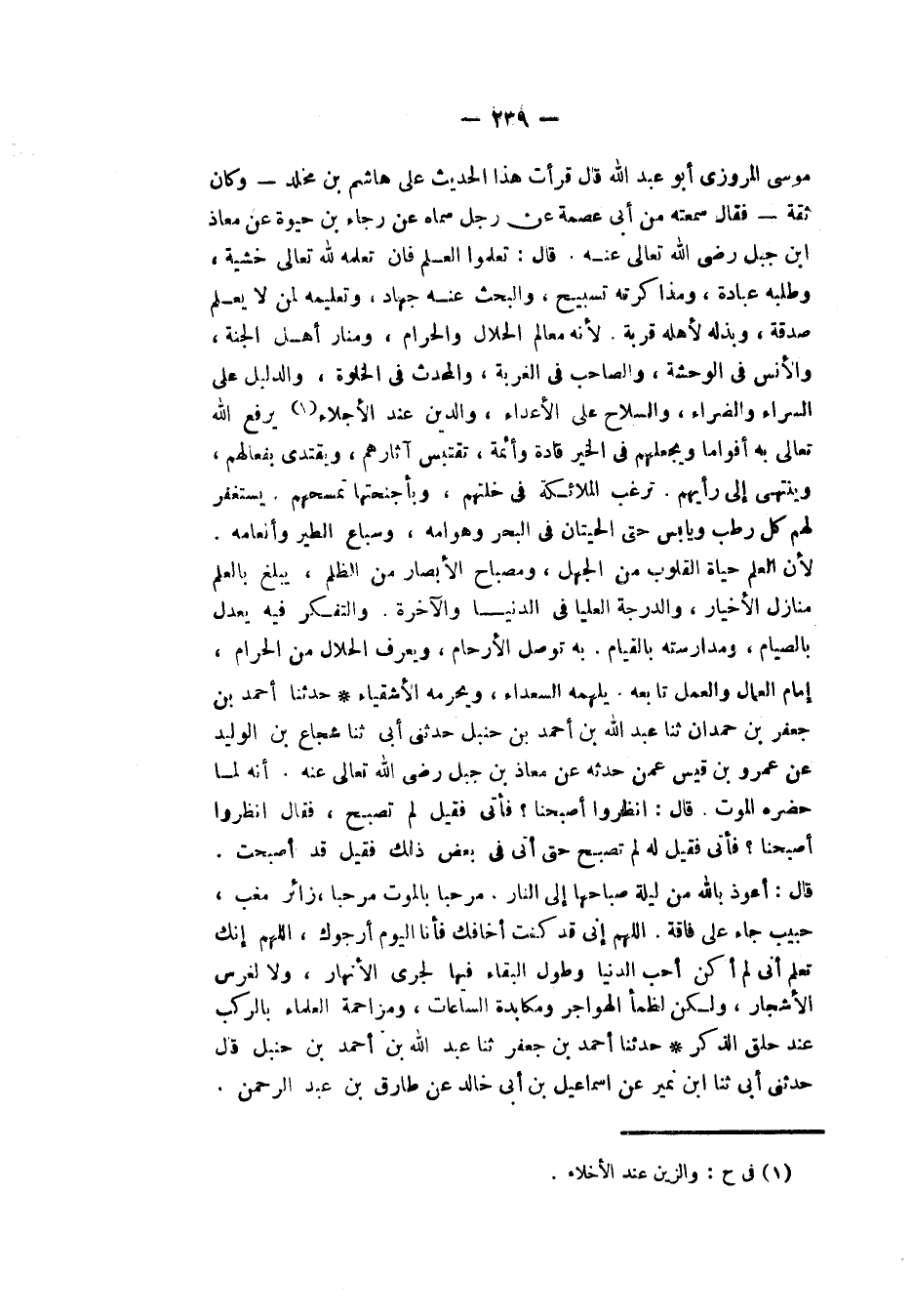 حَدَّثَنَا أَحْمَدُ بْنُ جَعْفَرِ بْنِ حَمْدَانَ، ثَنَا عَبْدُ اللهِ بْنُ أَحْمَدَ بْنِ حَنْبَلٍ، حَدَّثَنِي أَبِي، ثَنَا شُجَاعُ بْنُ الْوَلِيدِ، عَنْ عَمْرِو بْنِ قَيْسٍ، عَمَّنْ حَدَّثَهُ، عَنْ مُعَاذِ بْنِ جَبَلٍ، رَضِيَ اللهُ تَعَالَى عَنْهُ، أَنَّهُ لَمَّا حَضَرَهُ الْمَوْتُ قَالَ: «انْظُرُوا أَصْبَحْنَا؟» فَأُتِيَ فَقِيلَ: لَمْ تُصْبِحْ، فَقَالَ: «انْظُرُوا أَصْبَحْنَا؟» فَأُتِيَ فَقِيلَ لَهُ: لَمْ تُصْبِحْ، حَتَّى أُتِيَ فِي بَعْضِ ذَلِكَ فَقِيلَ: قَدْ أَصْبَحْتَ، قَالَ: §أَعُوذُ بِاللهِ مِنْ لَيْلَةٍ صَبَاحُهَا إِلَى النَّارِ، مَرْحَبًا بِالْمَوْتِ مَرْحَبًا، زَائِرٌ مُغِبٌّ، حَبِيبٌ جَاءَ عَلَى فَاقَةٍ، اللهُمَّ إِنِّي قَدْ كُنْتُ أَخَافَكَ، فَأَنَا الْيَوْمَ أَرْجُوكَ، اللهُمَّ إِنَّكَ تَعْلَمُ أَنِّي لَمْ أَكُنْ أُحِبُّ الدُّنْيَا وَطُولَ الْبَقَاءِ فِيهَا لِجَرْيِ الْأَنْهَارِ، وَلَا لِغَرْسِ الْأَشْجَارِ، وَلَكِنْ لَظَمَأِ الْهَوَاجِرِ، وَمُكَابَدَةِ السَّاعَاتِ، وَمُزَاحَمَةِ الْعُلَمَاءِ بِالرُّكَبِ عَنِ حِلَقِ الذِّكْرِ "