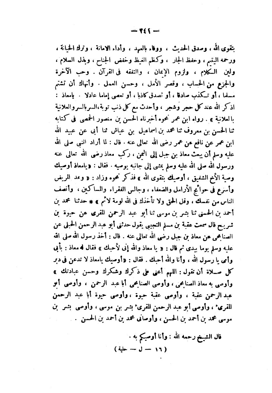 حَدَّثَنَا مُحَمَّدُ بْنُ أَحْمَدَ بْنِ الْحَسَنِ، ثَنَا بِشْرُ بْنُ مُوسَى، ثَنَا أَبُو عَبْدِ الرَّحْمَنِ الْمُقْرِئُ، عَنْ حَيْوَةَ بْنِ شُرَيْحٍ، قَالَ: سَمِعْتُ عُقْبَةَ بْنَ مُسْلِمٍ التُّجِيبِيُّ، يَقُولُ: حَدَّثَنِي أَبُو عَبْدِ الرَّحْمَنِ الْحُبُلِيُّ، عَنِ الصُّنَابِحِيِّ، عَنْ مُعَاذِ بْنِ جَبَلٍ، رَضِيَ اللهُ تَعَالَى عَنْهُ قَالَ: أَخَذَ رَسُولُ اللهِ صَلَّى اللهُ عَلَيْهِ وَسَلَّمَ يَوْمًا بِيَدِي ثُمَّ قَالَ: «يَا مُعَاذُ، وَاللهِ إِنِّي لَأُحِبُّكَ»، فَقَالَ لَهُ مُعَاذٌ: بِأَبِي وَأُمِّي يَا رَسُولَ اللهِ، وَأَنَا وَاللهِ أُحِبُّكَ. فَقَالَ: " أُوصِيكَ يَا مُعَاذُ، لَا تَدَعَنَّ فِي دُبُرِ كُلِّ صَلَاةٍ أَنْ تَقُولَ: «§اللهُمَّ أَعِنِّي عَلَى ذِكْرِكَ وَشُكْرِكَ وَحُسْنِ عِبَادَتِكَ»، وَأَوْصَى بِهِ مُعَاذٌ الصُّنَابِحِيَّ، وَأَوْصَى الصُّنَابِحِيُّ أَبَا عَبْدِ الرَّحْمَنِ، وَأَوْصَى أَبُو عَبْدِ الرَّحْمَنِ عُقْبَةَ، وَأَوْصَى عُقْبَةُ حَيْوَةَ، وَأَوْصَى حَيْوَةُ أَبَا عَبْدِ الرَّحْمَنِ الْمُقْرِئَ، وَأَوْصَى أَبُو عَبْدِ الرَّحْمَنِ الْمُقْرِئُ بِشْرَ بْنَ مُوسَى، وَأَوْصَى بِشْرُ بْنُ مُوسَى مُحَمَّدَ بْنَ أَحْمَدَ بْنِ الْحَسَنِ، وَأَوْصَانِي مُحَمَّدُ بْنُ أَحْمَدَ بْنِ الْحَسَنِ قَالَ الشَّيْخُ رَحِمَهُ اللهُ: وَأَنَا أُوصِيكُمْ بِهِ