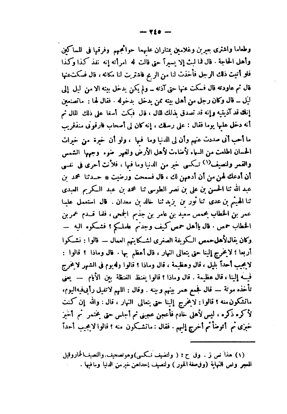حَدَّثَنَا مُحَمَّدُ بْنُ عَبْدِ اللهِ، ثَنَا الْحَسَنُ بْنُ عَلِيِّ بْنِ نَصْرٍ الطُّوسِيُّ، ثَنَا مُحَمَّدُ بْنُ عَبْدِ الْكَرِيمِ الْعَبْدِيُّ، ثَنَا الْهَيْثَمُ بْنُ عَدِيٍّ، ثَنَا ثَوْرُ بْنُ يَزِيدَ، ثَنَا خَالِدُ بْنُ مَعْدَانَ، قَالَ: اسْتَعْمَلَ عَلَيْنَا عُمَرُ بْنُ الْخَطَّابِ بِحِمْصَ سَعِيدَ بْنَ عَامِرِ بْنِ جُذَيْمٍ الْجُمَحِيُّ، فَلَمَّا قَدِمَ عُمَرُ بْنُ الْخَطَّابِ حِمْصَ قَالَ: يَا أَهْلَ حِمْصَ، كَيْفَ وَجَدْتُمْ عَامِلَكُمْ؟ فَشَكَوْهُ إِلَيْهِ - وَكَانَ يُقَالُ لِأَهْلِ حِمْصَ: الْكُوَيْفَةُ الصُّغْرَى لِشِكَايَتِهِمُ الْعُمَّالَ - قَالُوا: نَشْكُو أَرْبَعًا: لَا يَخْرُجُ إِلَيْنَا حَتَّى يَتَعَالَى النَّهَارُ، قَالَ: أَعْظِمْ بِهَا، قَالَ: وَمَاذَا؟ قَالُوا: لَا يُجِيبُ أَحَدًا بِلَيْلٍ، قَالَ: وَعَظِيمَةٌ، قَالَ: وَمَاذَا؟ قَالُوا: وَلَهُ يَوْمٌ فِي الشَّهْرِ لَا يَخْرُجُ فِيهِ إِلَيْنَا، قَالَ: عَظِيمَةٌ، قَالَ: وَمَاذَا؟ قَالُوا: يَغْنَظُ الْغُنْظَةَ بَيْنَ الْأَيَّامِ - يَعْنِي تَأْخُذُهُ مَوْتَةٌ - قَالَ: فَجَمَعَ عُمَرُ بَيْنَهُمْ وَبَيْنَهُ وَقَالَ: اللهُمَّ لَا تُقْبَلْ رَأْيِي فِيهِ الْيَوْمَ، مَا تَشْكُونَ مِنْهُ؟ قَالُوا: لَا يَخْرُجُ إِلَيْنَا حَتَّى يَتَعَالَى النَّهَارُ، قَالَ: «وَاللهِ إِنْ كُنْتُ لَأَكْرَهُ ذِكْرَهُ، لَيْسَ لِأَهْلِي خَادِمٌ فَأَعْجِنُ عَجِينِي ثُمَّ أَجْلِسُ حَتَّى يَخْتَمِرَ ثُمَّ أَخْبِزُ خُبْزِي، ثُمَّ أَتَوَضَّأُ ثُمَّ أَخْرَجُ إِلَيْهِمْ» فَقَالَ: مَا تَشْكُونَ مِنْهُ؟ قَالُوا: لَا يُجِيبُ أَحَدًا