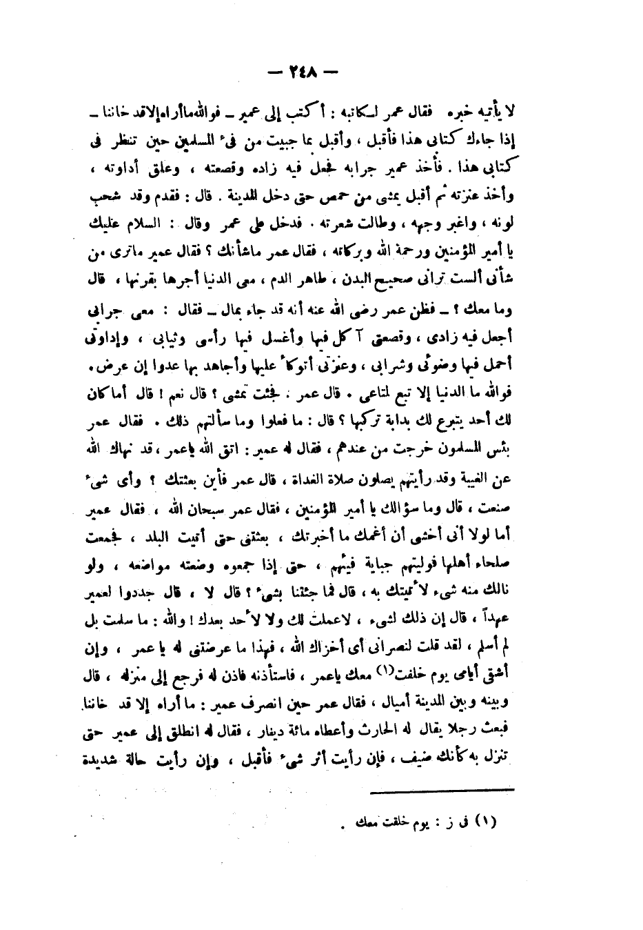 لَا يَأْتِيهِ خَبَرُهُ فَقَالَ عُمَرُ لِكَاتِبِهِ: " اكْتُبْ إِلَى عُمَيْرٍ، فَوَاللهِ مَا أُرَاهُ إِلَّا قَدْ خَانَنَا: إِذَا جَاءَكَ كِتَابِي هَذَا فَأَقْبِلْ، وَأَقْبِلْ بِمَا جَبَيْتَ مِنْ فَيْءِ الْمُسْلِمِينَ حِينَ تَنْظُرُ فِي كِتَابِي هَذَا " فَأَخَذَ عُمَيْرٌ جَوَابَهُ فَجَعَلَ فِيهِ زَادَهُ وَقَصْعَتَهُ، وَعَلَّقَ إِدَاوَتَهُ، وَأَخَذَ عَنْزَتَهُ، ثُمَّ أَقْبَلَ يَمْشِي مِنْ حِمْصَ حَتَّى دَخَلَ الْمَدِينَةَ، قَالَ: فَقَدِمَ وَقَدْ شَحَبَ لَوْنُهُ، وَاغْبَرَّ وَجْهُهُ، وَطَالَتْ شَعْرَتُهُ، فَدَخَلَ عَلَى عُمَرَ وَقَالَ: السَّلَامُ عَلَيْكَ يَا أَمِيرَ الْمُؤْمِنِينَ وَرَحْمَةُ اللهِ وَبَرَكَاتُهُ، فَقَالَ عُمَرُ: «مَا شَأْنُكَ؟» فَقَالَ عُمَيْرٌ: مَا تَرَى مِنْ شَأْنِي، أَلَسْتَ تَرَانِي صَحِيحَ الْبَدَنِ طَاهِرَ الدَّمِ مَعِيَ الدُّنْيَا أَجُرُّهَا بِقَرْنِهَا؟ قَالَ: " وَمَا مَعَكَ؟ فَظَنَّ عُمَرُ رَضِيَ اللهُ عَنْهُ أَنَّهُ قَدْ جَاءَ بِمَالٍ، فَقَالَ: مَعِي جِرَابِي أَجْعَلُ فِيهِ زَادِي، وَقَصْعَتِي آكُلُ فِيهَا وَأَغْسِلُ فِيهَا رَأْسِي وَثِيَابِي، وَإِدَاوَتِي أَحْمِلُ فِيهَا وَضُوئِي وَشَرَابِي، وَعَنْزَتِي أَتَوَكَّأُ عَلَيْهَا وَأُجَاهِدُ بِهَا عَدُوًّا إِنْ عَرَضَ، فَوَاللهِ مَا الدُّنْيَا إِلَّا تَبَعٌ لِمَتَاعِي. قَالَ عُمَرُ: «فَجِئْتَ تَمْشِي؟» قَالَ: نَعَمْ، قَالَ: «أَمَا كَانَ لَكَ أَحَدٌ يَتَبَرَّعُ لَكَ بِدَابَّةٍ تَرْكَبُهَا؟» قَالَ: مَا فَعَلُوا، وَمَا سَأَلْتُهُمْ ذَلِكَ؟ فَقَالَ عُمَرُ: «بِئْسَ الْمُسْلِمُونَ خَرَجْتَ مِنْ عِنْدِهِمْ» فَقَالَ لَهُ عُمَيْرٌ: اتَّقِ اللهَ يَا عُمَرُ، قَدْ نَهَاكَ اللهُ عَنِ الْغِيبَةِ، وَقَدْ رَأَيْتُهُمْ يُصَلُّونَ صَلَاةَ الْغَدَاةِ، قَالَ عُمَرُ: «فَأَيْنَ بَعَثْتُكَ، وَأَيَّ شَيْءٍ صَنَعْتَ؟» قَالَ: وَمَا سُؤَالُكَ يَا أَمِيرَ الْمُؤْمِنِينَ؟ فَقَالَ عُمَرُ: «سُبْحَانَ اللهِ» فَقَالَ عُمَيْرٌ: أَمَا لَوْلَا أَنِّي أَخْشَى أَنْ أَغُمَّكَ مَا أَخْبَرْتُكَ، بَعَثْتَنِي حَتَّى أَتَيْتُ الْبَلَدَ فَجَمَعْتُ صُلَحَاءَ أَهْلِهَا فَوَلَّيْتُهُمْ جِبَايَةَ فَيْئِهِمْ، حَتَّى إِذَا جَمَعُوهُ وَضَعْتُهُ مَوَاضِعَهُ، وَلَوْ نَالَكَ مِنْهُ شَيْءٌ لَأَتَيْتُكَ بِهِ، قَالَ: «فَمَا جِئْتَنَا بِشَيْءٍ؟» قَالَ: لَا، قَالَ: «جَدِّدُوا لِعُمَيْرٍ عَهْدًا» قَالَ: إِنَّ ذَلِكَ لَشَيْءٍ، لَا عَمِلْتُ لَكَ وَلَا لِأَحَدٍ بَعْدَكَ، وَاللهِ مَا سَلِمْتُ، بَلْ لَمْ أَسْلَمْ، لَقَدْ قُلْتُ لِنَصْرَانِي أَيْ أَخْزَاكَ اللهُ، فَهَذَا مَا عَرَّضْتَنِي لَهُ يَا عُمَرُ، وَإِنَّ أَشْقَى أَيَامِي يَوْمُ خَلَفْتُ مَعَكَ يَا عُمَرُ، فَاسْتَأْذَنَهُ فَأَذِنَ لَهُ فَرَجَعَ إِلَى مَنْزِلِهِ، قَالَ: وَبَيْنَهُ وَبَيْنَ الْمَدِينَةِ أَمْيَالٌ، فَقَالَ عُمَرُ حِينَ انْصَرَفَ عُمَيْرٌ: «مَا أُرَاهُ إِلَّا قَدْ خَانَنَا»، فَبَعَثَ رَجُلًا يُقَالُ لَهُ: الْحَارِثُ، وَأَعْطَاهُ مِائَةَ دِينَارٍ، فَقَالَ لَهُ: «انْطَلِقْ إِلَى عُمَيْرٍ حَتَّى تَنْزِلَ بِهِ كَأَنَّكَ ضَيْفٌ، فَإِنْ رَأَيْتَ أَثَرَ شَيْءٍ فَأَقْبِلْ، وَإِنْ رَأَيْتَ حَالَةً شَدِيدَةً