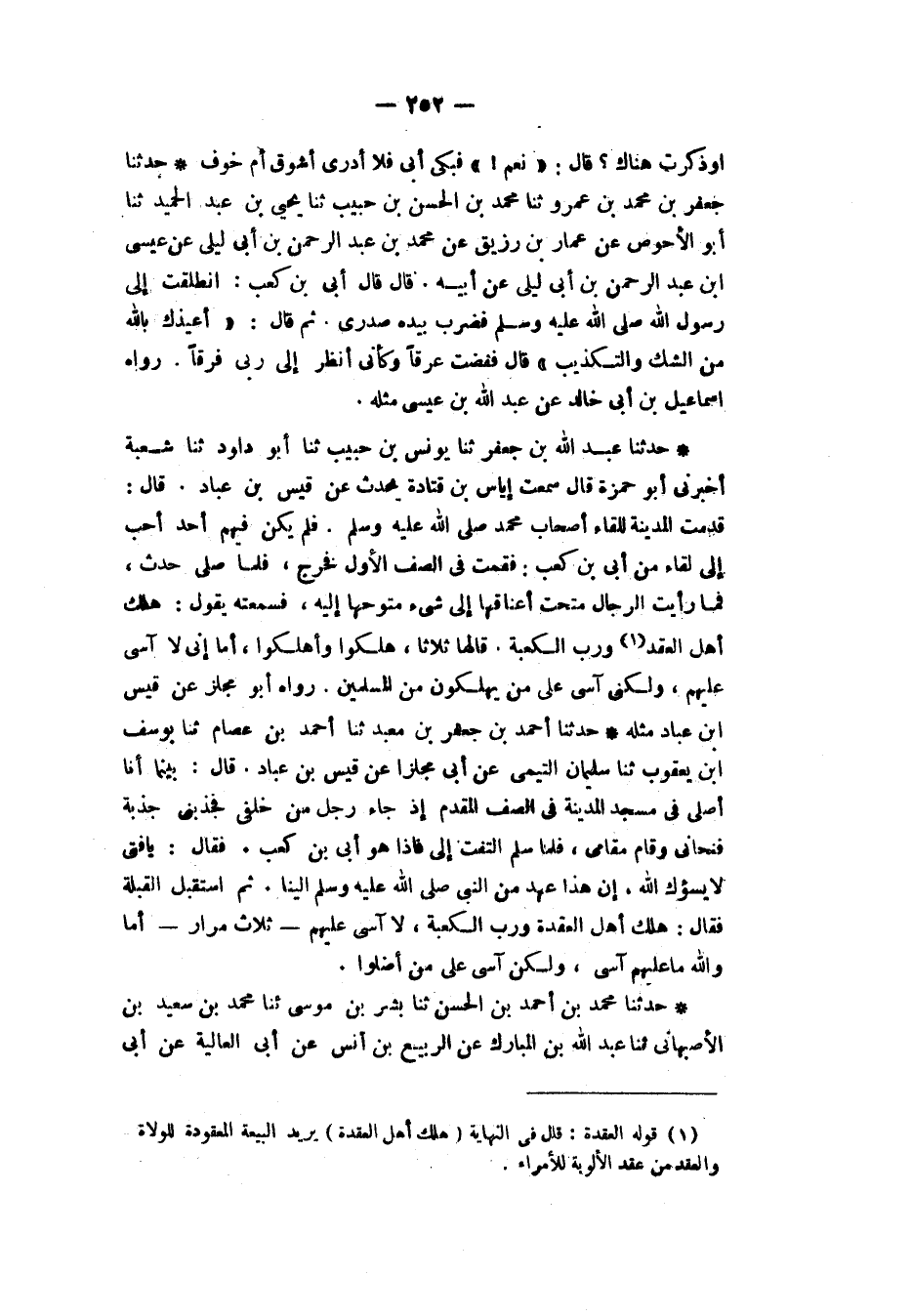 حَدَّثَنَا أَحْمَدُ بْنُ جَعْفَرِ بْنِ مَعْبَدٍ، ثَنَا أَحْمَدُ بْنُ عِصَامٍ، ثَنَا يُوسُفُ بْنُ يَعْقُوبَ، ثَنَا سُلَيْمَانُ التَّيْمِيُّ، عَنْ أَبِي مِجْلَزٍ، عَنْ قَيْسِ بْنِ عُبَادٍ، قَالَ: بَيْنَمَا أَنَا أُصَلِّي، فِي مَسْجِدِ الْمَدِينَةِ فِي الصَّفِّ الْمُقَدَّمِ، إِذْ جَاءَ رَجُلٌ مِنْ خَلْفِي فَجَذَبَنِي جَذْبَةً فَنَحَّانِي وَقَامَ مَقَامِي، فَلَمَّا سَلَّمَ الْتَفَتَ إِلَيَّ فَإِذَا هُوَ أُبَيُّ بْنُ كَعْبٍ فَقَالَ: «يَا فَتَى، لَا يَسُؤْكَ اللهُ، إِنَّ هَذَا عَهْدٌ مِنَ النَّبِيِّ صَلَّى اللهُ عَلَيْهِ وَسَلَّمَ إِلَيْنَا» ثُمَّ اسْتَقْبَلَ الْقِبْلَةَ فَقَالَ: «§هَلَكَ أَهْلُ الْعُقْدَةِ وَرَبِّ الْكَعْبَةِ، لَا آسَى عَلَيْهِمْ - ثَلَاثَ مِرَارٍ - أَمَا وَاللهِ مَا عَلَيْهِمْ آسَى، وَلَكِنْ آسَى عَلَى مَنْ أَضَلُّوا»