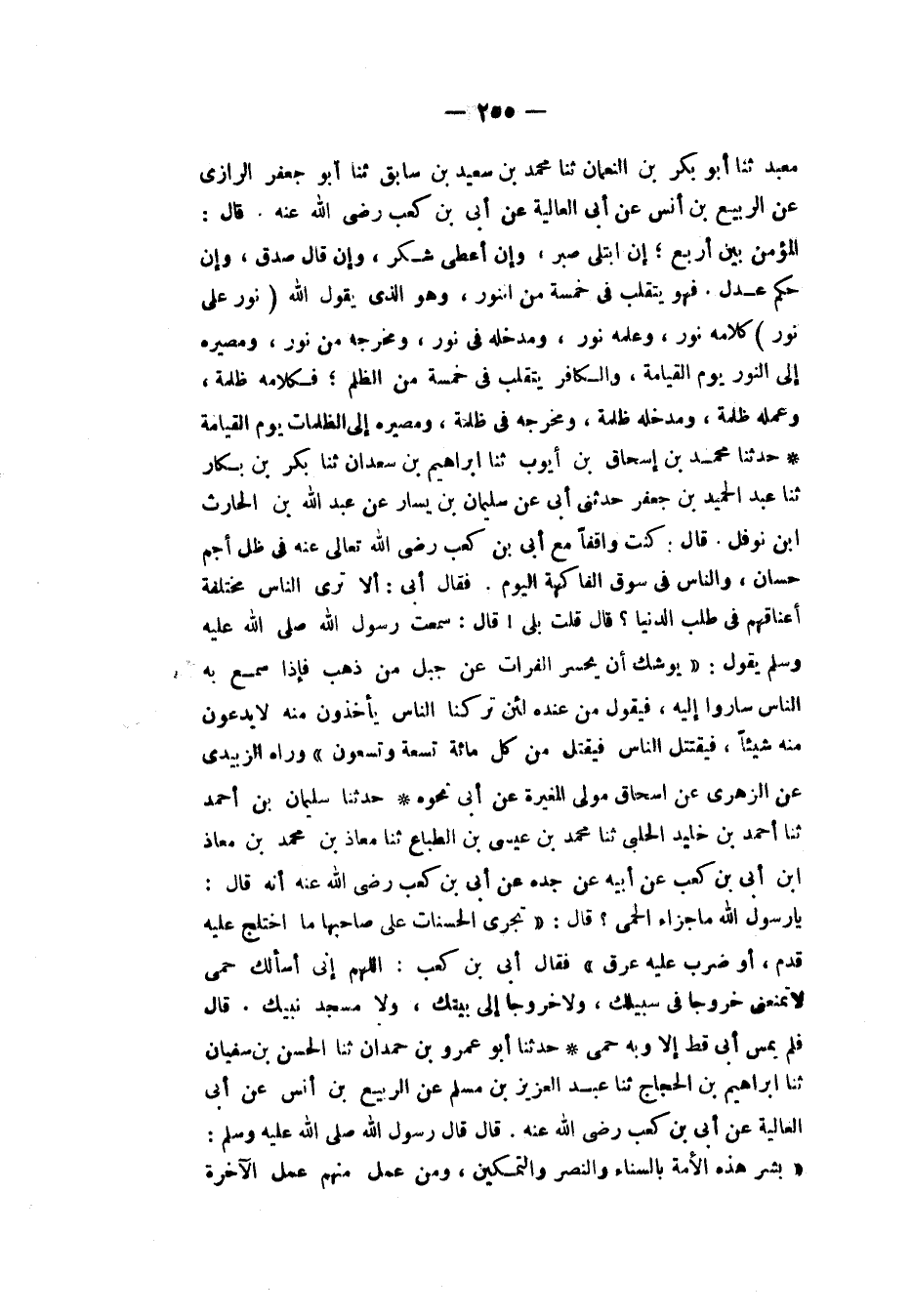 حَدَّثَنَا أَبُو عَمْرِو بْنُ حَمْدَانَ، ثَنَا الْحَسَنُ بْنُ سُفْيَانَ، ثَنَا إِبْرَاهِيمُ بْنُ الْحَجَّاجِ، ثَنَا عَبْدُ الْعَزِيزِ بْنُ مُسْلِمٍ، عَنِ الرَّبِيعِ بْنِ أَنَسٍ، عَنْ أَبِي الْعَالِيَةِ، عَنْ أُبَيِّ بْنِ كَعْبٍ، رَضِيَ اللهُ عَنْهُ قَالَ: قَالَ رَسُولُ اللهِ صَلَّى اللهُ عَلَيْهِ وَسَلَّمَ: «§بَشِّرْ هَذِهِ الْأُمَّةَ بِالسَّنَاءِ وَالنَّصْرِ وَالتَّمْكِينِ، وَمَنْ عَمِلَ مِنْهُمْ عَمَلَ الْآخِرَةِ -[256]- لِلدُّنْيَا فَلَمْ يَكُنْ لَهُ فِي الْآخِرَةِ مِنْ نَصِيبٍ»