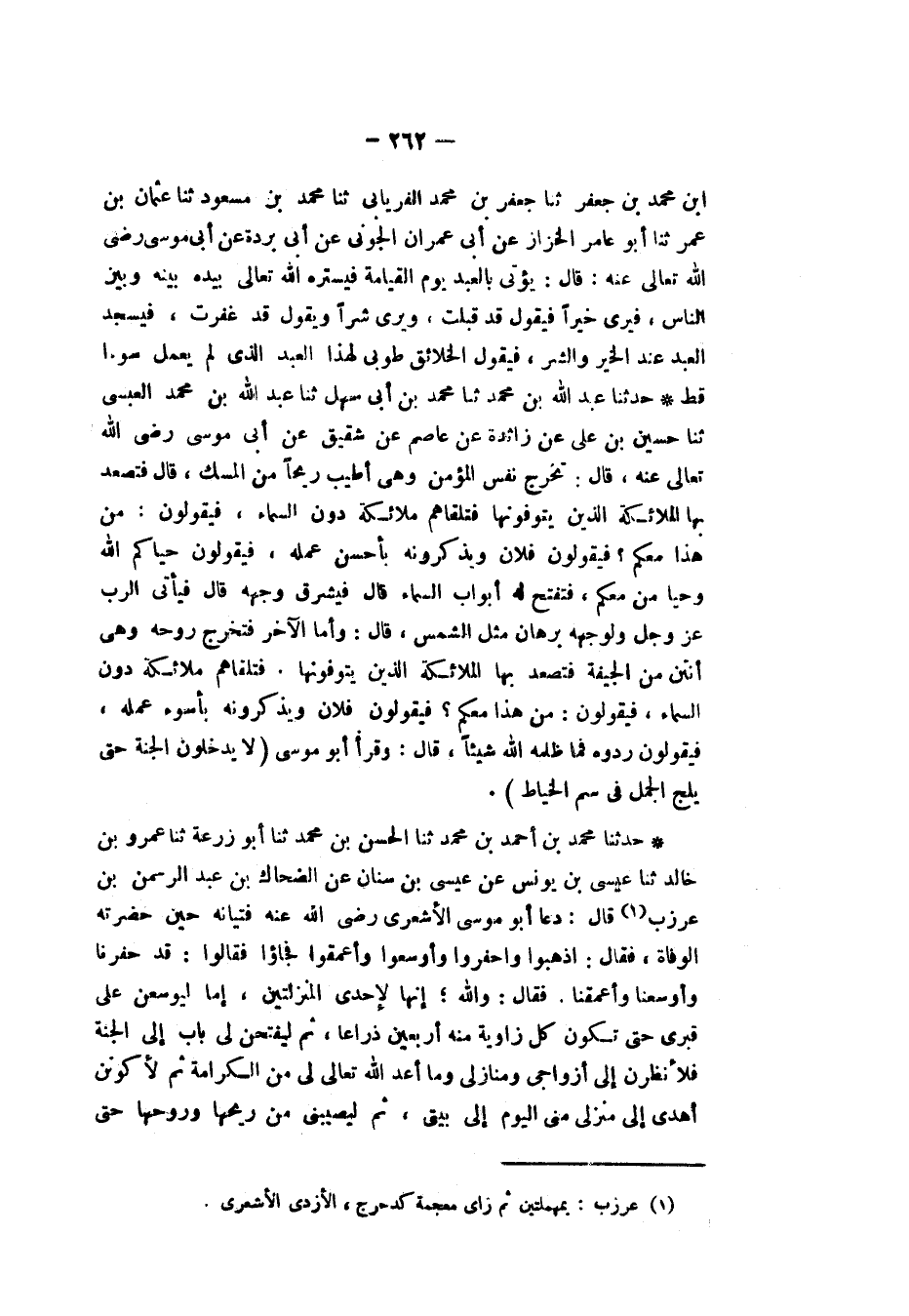 حَدَّثَنَا عَبْدُ اللهِ بْنُ مُحَمَّدٍ، ثَنَا مُحَمَّدُ بْنُ أَبِي سَهْلٍ، ثَنَا عَبْدُ اللهِ بْنُ مُحَمَّدٍ الْعَبْسِيُّ، ثَنَا حُسَيْنُ بْنُ عَلِيٍّ، عَنْ زَائِدَةَ، عَنْ عَاصِمٍ، عَنْ شَقِيقٍ، عَنْ أَبِي مُوسَى، رَضِيَ اللهُ تَعَالَى عَنْهُ قَالَ: " §تَخْرُجُ نَفْسُ الْمُؤْمِنِ وَهِيَ أَطْيَبُ رِيحًا مِنَ الْمِسْكِ، قَالَ: فَتَصْعَدُ بِهَا الْمَلَائِكَةُ الَّذِينَ يَتَوَفَّوْنَهَا فَتَلْقَاهُمْ مَلَائِكَةٌ دُونَ السَّمَاءِ فَيَقُولُونَ: مَنْ هَذَا مَعَكُمْ؟ فَيَقُولُونَ: فُلَانٌ، وَيَذْكُرُونَهُ بِأَحْسَنِ عَمَلِهِ، فَيَقُولُونَ: حَيَّاكُمُ اللهُ وَحَيَّا مَنْ مَعَكُمْ، فَتُفْتَحُ لَهُ أَبْوَابُ السَّمَاءِ، قَالَ: فَيُشْرِقُ وَجْهُهُ، قَالَ: فَيَأْتِي الرَّبُّ عَزَّ وَجَلَّ وَلِوَجْهِهِ بُرْهَانٌ مِثْلُ الشَّمْسِ. قَالَ: وَأَمَّا الْآخَرُ فَتَخْرُجُ رُوحُهُ وَهِيَ أَنْتَنُ مِنَ الْجِيفَةِ فَتَصْعَدُ بِهَا الْمَلَائِكَةُ الَّذِينَ يَتَوَفَّوْنَهَا فَتَلْقَاهُمْ مَلَائِكَةٌ دُونَ السَّمَاءِ فَيَقُولُونَ: مَنْ هَذَا مَعَكُمْ؟ فَيَقُولُونَ: فُلَانٌ، وَيَذْكُرُونَهُ بِأَسْوَأِ عَمَلِهِ، فَيَقُولُونَ: رُدُّوهُ فَمَا ظَلَمَهُ اللهُ شَيْئًا "، قَالَ: وَقَرَأَ أَبُو مُوسَى: " {لَا يَدْخُلُونَ الْجَنَّةَ حَتَّى يَلِجَ الْجَمَلُ فِي سَمِّ الْخِيَاطِ} [الأعراف: 40] "