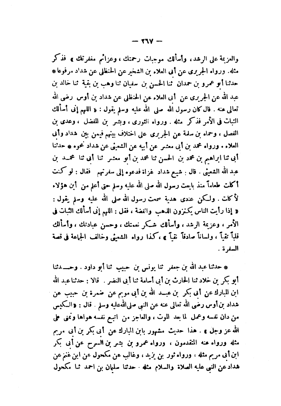 حَدَّثَنَا أَبِي، ثَنَا إِبْرَاهِيمُ بْنُ مُحَمَّدِ بْنِ الْحَسَنِ، ثَنَا مُحَمَّدُ بْنُ أَبيِ مَعْشَرٍ، ثَنَا أَبِي، ثَنَا مُحَمَّدُ بْنُ عَبْدِ اللهِ الشَّعِيثِيُّ، قَالَ: " شَيَّعَ شَدَّادٌ غَزَاةً فَدَعَوْهُ إِلَى سُفْرَتِهِمْ، فَقَالَ: لَوْ كُنْتُ أَكَلْتُ طَعَامًا مُنْذُ بَايَعْتُ رَسُولَ اللهِ صَلَّى اللهُ عَلَيْهِ وَسَلَّمَ حَتَّى أَعْلَمَ مِنْ أَيْنَ هَؤُلَاءِ لَأَكَلْتُ، وَلَكِنْ عِنْدِي هَدِيَّةٌ، سَمِعْتُ رَسُولَ اللهِ صَلَّى اللهُ عَلَيْهِ وَسَلَّمَ يَقُولُ: " §إِذَا رَأَيْتَ النَّاسَ يَكْنِزُونَ الذَّهَبَ وَالْفِضَّةَ فَقُلِ: اللهُمَّ إِنِّي أَسْأَلُكَ الثَّبَاتَ فِي الْأَمْرِ، وَعَزِيمَةَ الرُّشْدِ، وَأَسْأَلُكَ شُكْرَ نِعْمَتِكَ وَحُسْنَ عِبَادَتِكَ، وَأَسْأَلُكَ قَلْبًا تَقِيًّا، وَلِسَانًا صَادِقًا نَقِيًّا " كَذَا رَوَاهُ الشَّعِيثِيُّ وَخَالَفَ الْجَمَاعَةَ فِي قِصَّةِ السُّفْرَةِ