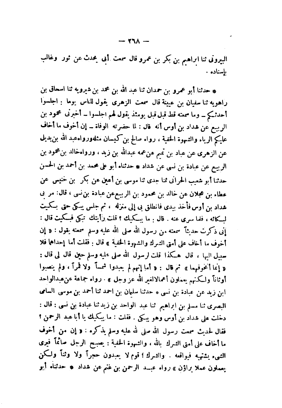 حَدَّثَنَا أَبُو عَمْرِو بْنُ حَمْدَانَ، ثَنَا عَبْدُ اللهِ بْنُ مُحَمَّدِ بْنِ شِيرَوَيْهِ، ثَنَا إِسْحَاقُ بْنُ رَاهَوَيْهِ، ثَنَا سُفْيَانُ بْنُ عُيَيْنَةَ، قَالَ: سَمِعْتُ الزُّهْرِيَّ، يَقُولُ لِلنَّاسِ يَوْمًا: اجْلِسُوا أُحَدِّثْكُمْ - وَمَا سَمِعْتُهُ قَطُّ قَبْلَ يَوْمَئِذٍ يَقُولُ لَهُمُ: اجْلِسُوا - أَخْبَرَنِي مَحْمُودُ بْنُ الرَّبِيعِ، عَنْ شَدَّادِ بْنِ أَوْسٍ أَنَّهُ قَالَ لَمَّا حَضَرَتْهُ الْوَفَاةُ: «إِنَّ §أَخْوَفَ مَا أَخَافُ عَلَيْكُمُ الرِّيَاءُ وَالشَّهْوَةُ الْخَفِيَّةُ» رَوَاهُ صَالِحُ بْنُ كَيْسَانَ مِثْلَهُ. وَرَوَاهُ عَبْدُ اللهِ بْنُ بُدَيْلٍ، عَنِ الزُّهْرِيِّ، عَنْ عَبَّادِ بْنِ تَمِيمٍ، عَنْ عَمِّهِ عَبْدِ اللهِ بْنِ زَيْدٍ. وَرَوَاهُ خَالِدُ بْنُ مَحْمُودِ بْنِ الرَّبِيعِ، عَنْ عُبَادَةَ بْنِ نَسِيٍّ، عَنْ شَدَّادٍ