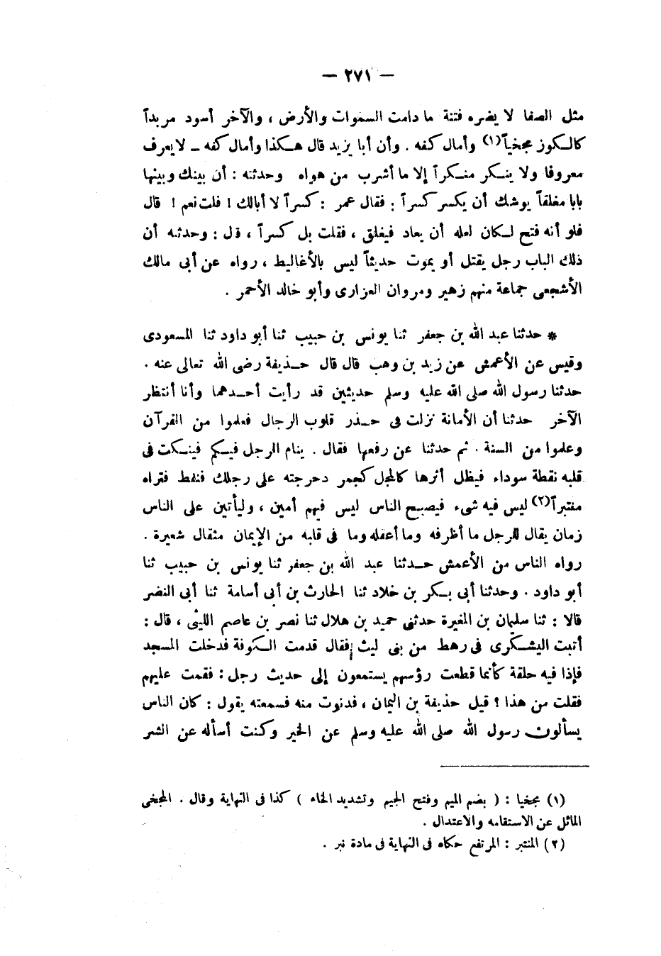 حَدَّثَنَا عَبْدُ اللهِ بْنُ جَعْفَرٍ، ثَنَا يُونُسُ بْنُ حَبِيبٍ، ثَنَا أَبُو دَاوُدَ، ثَنَا الْمَسْعُودِيُّ، وَقَيْسٌ، عَنِ الْأَعْمَشِ، عَنْ زَيْدِ بْنِ وَهْبٍ، قَالَ: قَالَ حُذَيْفَةُ رَضِيَ اللهُ تَعَالَى عَنْهُ: حَدَّثَنَا رَسُولُ اللهِ صَلَّى اللهُ عَلَيْهِ وَسَلَّمَ حَدِيثَيْنِ، قَدْ رَأَيْتُ أَحَدَهُمَا وَأَنَا أَنْتَظِرُ الْآخَرَ، حَدَّثَنَا أَنَّ §الْأَمَانَةَ نَزَلَتْ فِي جَذْرِ قُلُوبِ الرِّجَالِ، فَعَلِمُوا مِنَ الْقُرْآنِ وَعَلِمُوا مِنَ السُّنَّةِ. ثُمَّ حَدَّثَنَا عَنْ رَفْعِهَا فَقَالَ: " يَنَامُ الرَّجُلُ فِيكُمْ فَيُنْكَتُ فِي قَلْبِهِ نُكْتَةٌ سَوْدَاءُ، فَيَظَلُّ أَثَرُهَا كَالْمَجَلِّ كَجَمْرٍ دَحْرَجْتَهُ عَلَى رِجْلِكَ فَنَفَطَ، فَتَرَاهُ مُنْتَبِرًا لَيْسَ فِيهِ شَيْءٌ، فَيُصْبِحُ النَّاسُ لَيْسَ فِيهِمْ أَمِينٌ، وَلَيَأْتِيَنَّ عَلَى النَّاسِ زَمَانٌ يُقَالُ لِلرَّجُلِ: مَا أَظْرَفَهُ وَمَا أَعْقَلَهُ وَمَا فِي قَلْبِهِ مِنَ الْإِيمَانِ مِثْقَالُ شَعِيرَةٍ ". رَوَاهُ النَّاسُ عَنِ الْأَعْمَشِ