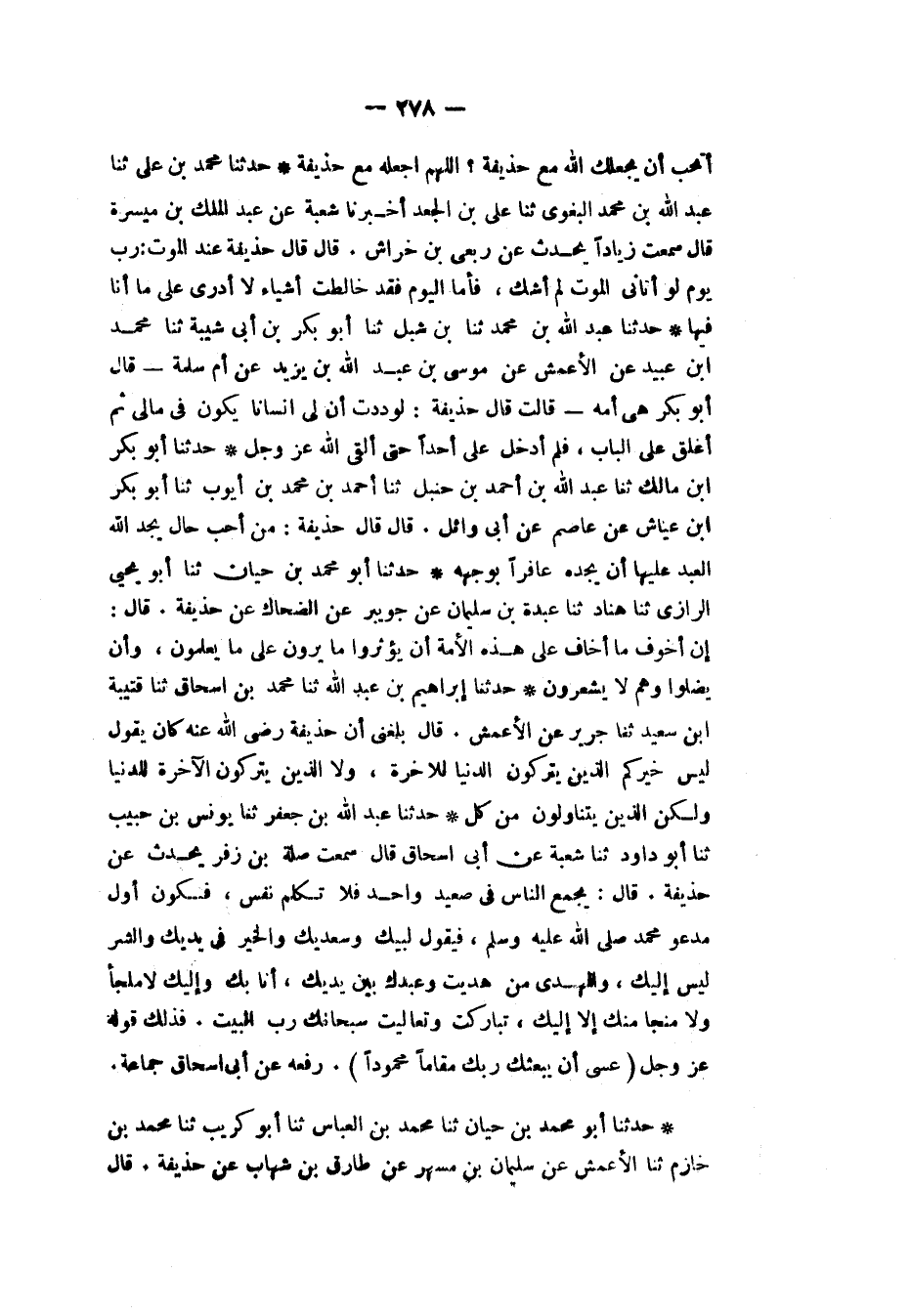 حَدَّثَنَا أَبُو بَكْرِ بْنُ مَالِكٍ، ثَنَا عَبْدُ اللهِ بْنُ أَحْمَدَ بْنِ حَنْبَلٍ، ثَنَا أَحْمَدُ بْنُ مُحَمَّدِ بْنِ أَيُّوبَ، ثَنَا أَبُو بَكْرِ بْنُ عَيَّاشٍ، عَنْ عَاصِمٍ، عَنْ أَبِي وَائِلٍ، قَالَ: قَالَ حُذَيْفَةُ: «§مِنْ أَحَبِّ حَالٍ يَجِدُ اللهُ الْعَبْدَ عَلَيْهَا أَنْ يَجِدَهُ عَافِرًا بِوَجْهِهِ»