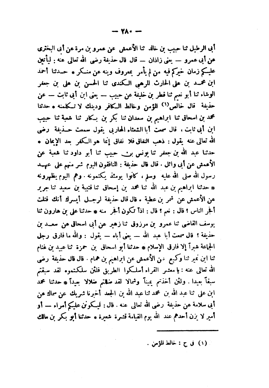حَدَّثَنَا مُحَمَّدُ بْنُ إِسْحَاقَ، ثَنَا إِبْرَاهِيمُ بْنُ سَعْدَانَ، ثَنَا بَكْرُ بْنُ بَكَّارٍ، ثَنَا شُعْبَةُ، ثَنَا حَبِيبُ بْنُ أَبِي ثَابِتٍ، قَالَ: سَمِعْتُ أَبَا الشَّعْثَاءِ الْمُحَارِبِيَّ، يَقُولُ: سَمِعْتُ حُذَيْفَةَ، رَضِيَ اللهُ تَعَالَى عَنْهُ يَقُولُ: «§ذَهَبَ النِّفَاقُ فَلَا نِفَاقَ، إِنَّمَا هُوَ الْكُفْرُ بَعْدَ الْإِيمَانِ»