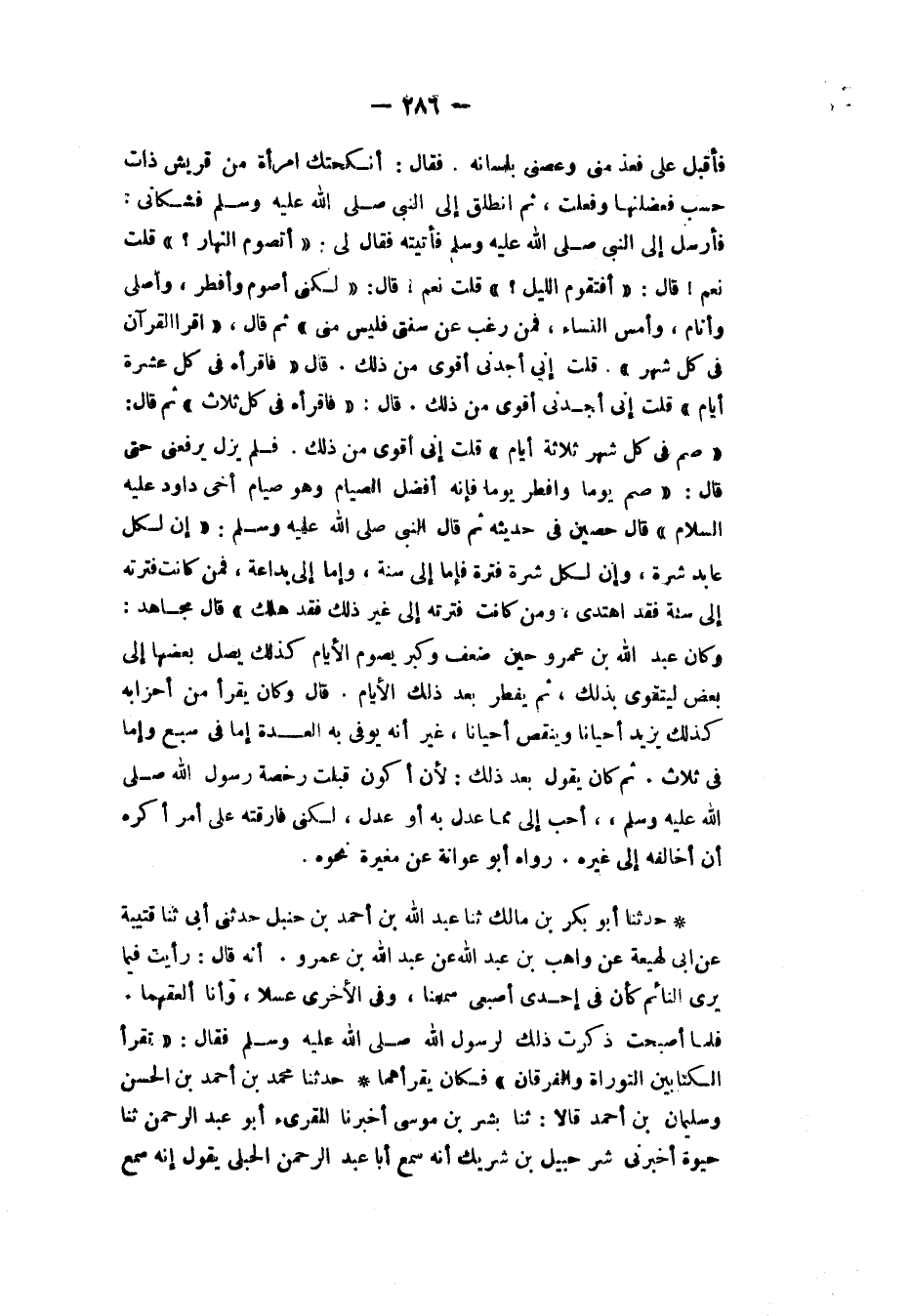 حَدَّثَنَا أَبُو بَكْرِ بْنُ مَالِكٍ، ثَنَا عَبْدُ اللهِ بْنُ أَحْمَدَ بْنِ حَنْبَلٍ، حَدَّثَنِي أَبِي، ثَنَا قُتَيْبَةُ، عَنِ ابْنِ لَهِيعَةَ، عَنْ وَاهِبِ بْنِ عَبْدِ اللهِ، عَنْ عَبْدِ اللهِ بْنِ عَمْرٍو، أَنَّهُ قَالَ: رَأَيْتُ فِيمَا يَرَى النَّائِمُ كَأَنَّ فِي إِحْدَى أُصْبُعَيَّ سَمْنًا، وَفِي الْأُخْرَى عَسَلًا، وَأَنَا أَلْعَقُهُمَا، فَلَمَّا أَصْبَحْتُ ذَكَرْتُ ذَلِكَ لِرَسُولِ اللهِ صَلَّى اللهُ عَلَيْهِ وَسَلَّمَ فَقَالَ: " §تَقْرَأُ الْكِتَابَيْنِ: التَّوْرَاةَ وَالْفُرْقَانَ "، فَكَانَ يَقْرَؤُهُمَا