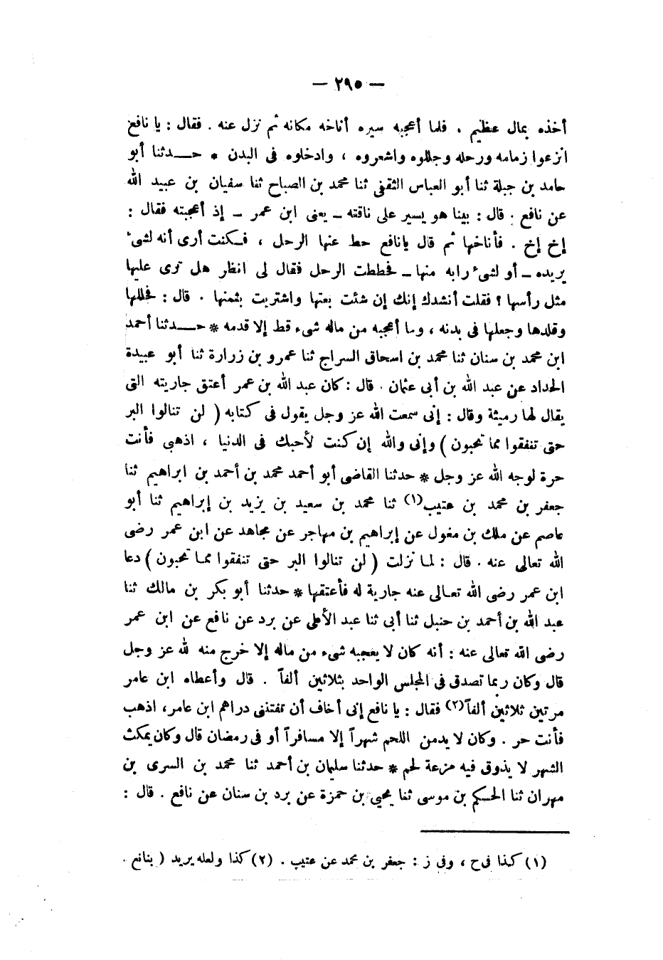 حَدَّثَنَا أَبُو حَامِدِ بْنُ جَبَلَةَ، ثَنَا أَبُو الْعَبَّاسِ الثَّقَفِيُّ، ثَنَا مُحَمَّدُ بْنُ الصَّبَّاحِ، ثَنَا سُفْيَانُ بْنُ عُبَيْدِ اللَّهِ، عَنْ نَافِعٍ، قَالَ: بَيْنَا هُوَ يَسِيرُ عَلَى نَاقَتِهِ - يَعْنِي ابْنَ عُمَرَ - إِذْ أَعْجَبَتْهُ، فَقَالَ: إِخْ إِخْ، فَأَنَاخَهَا ثُمَّ قَالَ: يَا نَافِعُ حُطَّ عَنْهَا الرَّحْلَ، فَكُنْتُ أَرَى أَنَّهُ لِشَيْءٍ يُرِيدُهُ - أَوْ لِشَيْءٍ رَابَهُ مِنْهَا - فَحَطَطْتُ الرَّحْلَ، فَقَالَ لِي: انْظُرْ هَلْ تَرَى عَلَيْهَا مِثْلَ رَأْسِهَا؟ فَقُلْتُ: أَنْشُدُكَ إِنَّكَ إِنْ شِئْتَ بِعْتَهَا وَاشْتَرَيْتَ بِثَمَنِهَا، قَالَ: فَحَلَّلَهَا وَقَلَّدَهَا، وَجَعَلَهَا فِي بُدْنِهِ، وَمَا أَعْجَبَهُ مِنْ مَالِهِ شَيْءٌ قَطُّ إِلَّا قَدَّمَهُ.
